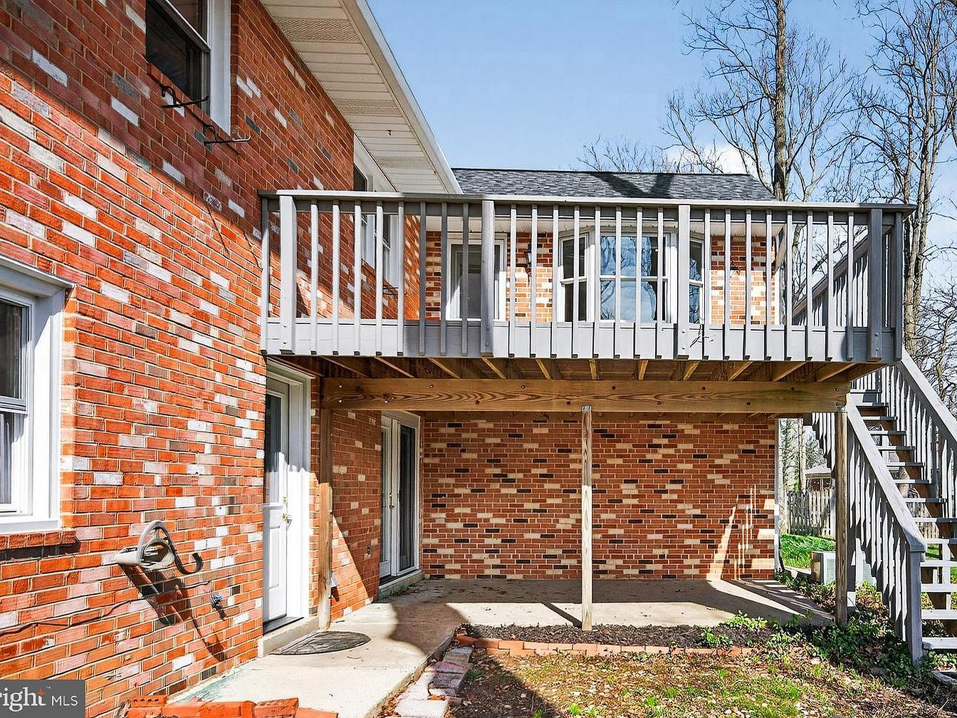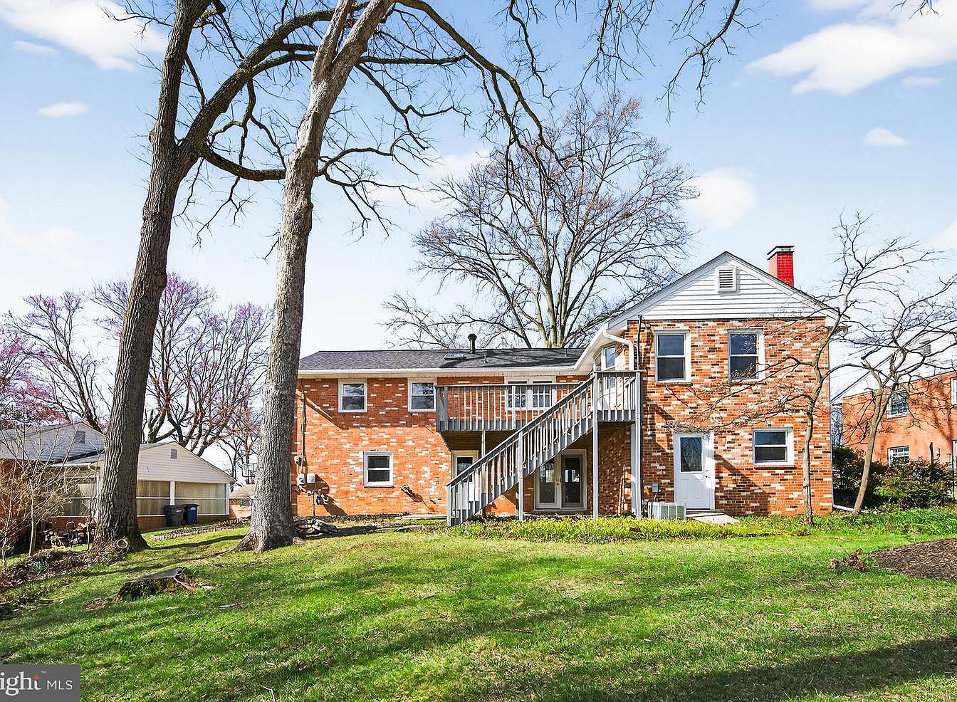 This image captures the rear exterior of a historic American home, showcasing a blend of brick and siding. The vibrant orange brick contrasts with the light-colored siding on the upper level, while large windows invite natural light. A wooden deck with a sloped staircase connects the lower and upper levels, providing accessibility and inviting outdoor gatherings. The grassy yard is well-maintained, bordered by mature trees that add depth to the landscape. Behind the house, more residential structures are subtly visible, indicating a neighborhood setting. The clear sky above adds to the serene atmosphere of the scene.