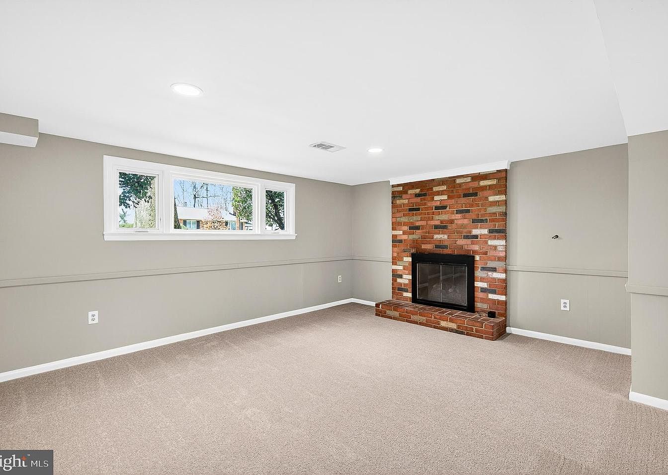 The space is a cozy basement lounge featuring a warm, inviting atmosphere. A brick fireplace with a black screen enhances its charm, surrounded by a smooth beige carpet that adds comfort. Light taupe walls create a soft backdrop, complemented by white trim. A long, narrow window provides natural light, showcasing the outdoor greenery while maintaining privacy. The room’s minimalistic design offers flexibility for various furniture arrangements, making it perfect for relaxation or entertaining. The blend of textures—from the brick to the carpet—creates a harmonious aesthetic, balancing modern comfort with traditional elements.