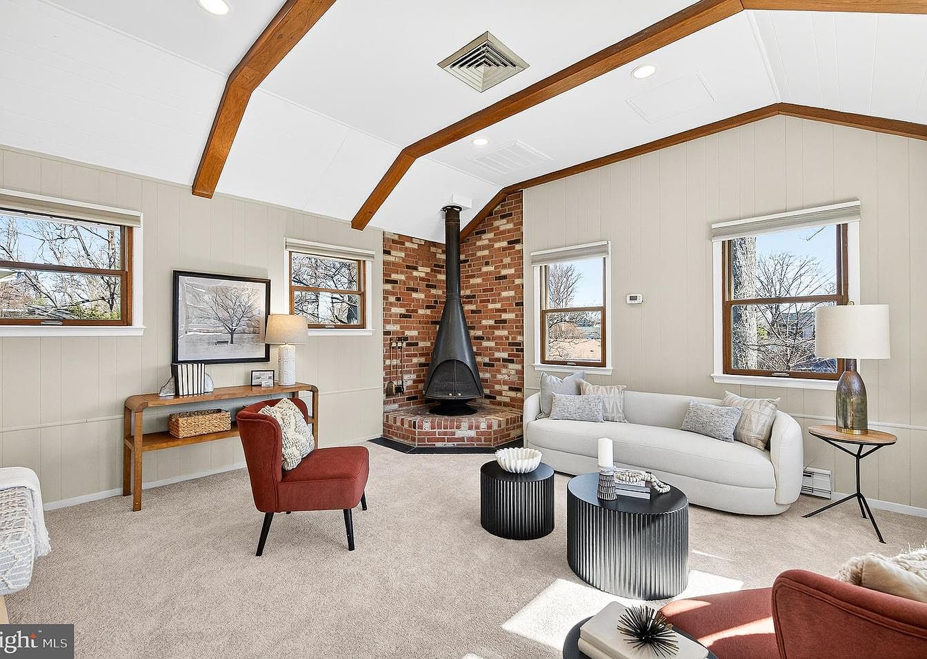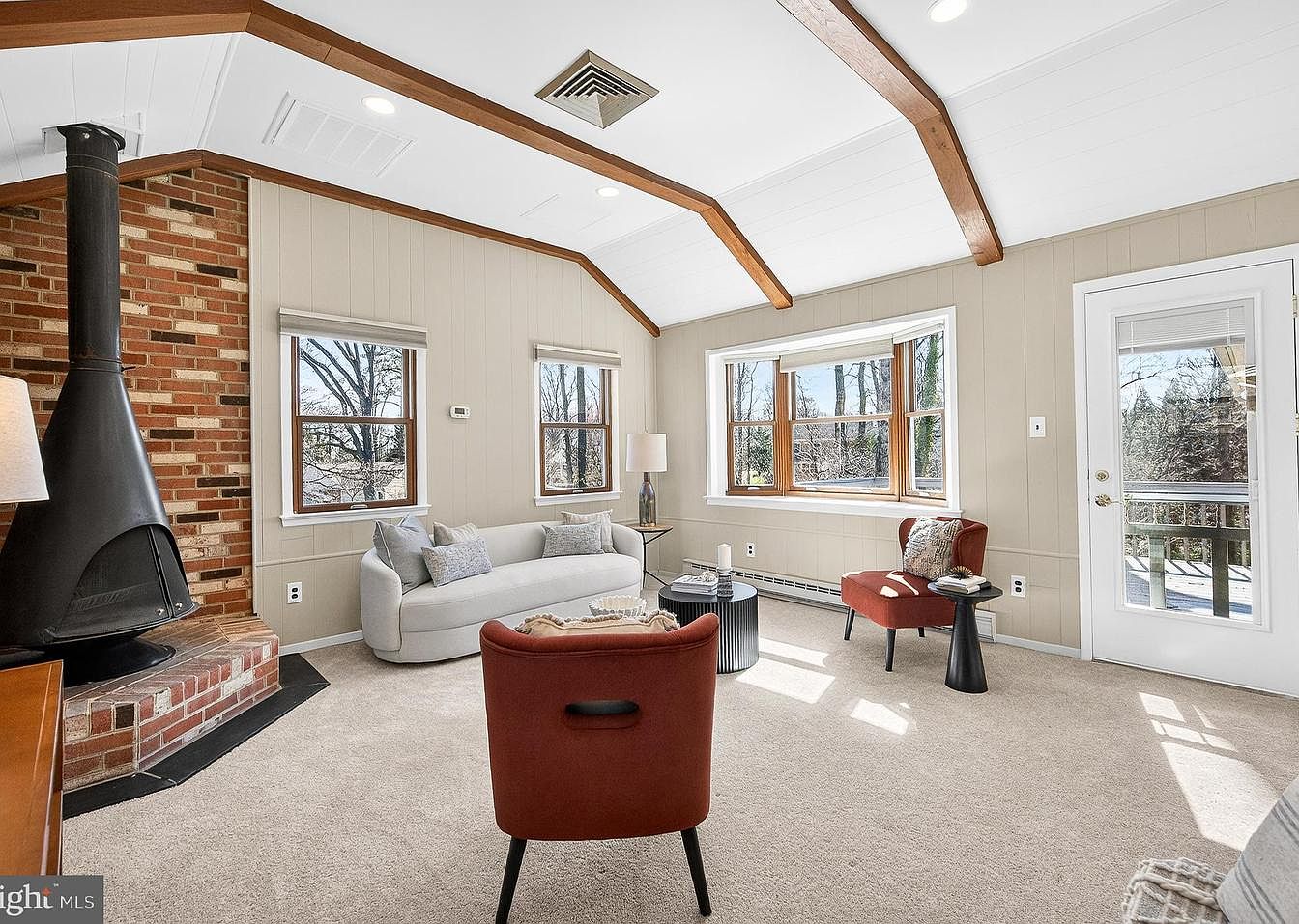 This sunroom features a cozy and inviting layout with natural light pouring in through multiple large windows. The walls have a soft beige paneling, complemented by warm wood beams stretching across the ceiling, enhancing the room’s height and charm. A modern, curved white sofa sits opposite two vibrant red accent chairs, providing a striking contrast. A sleek black coffee table marries the space together, while a stone fireplace with a unique shape lays against a brick background, creating a rustic focal point. The light carpeting adds warmth underfoot, enhancing the room’s overall comfort and aesthetic appeal.