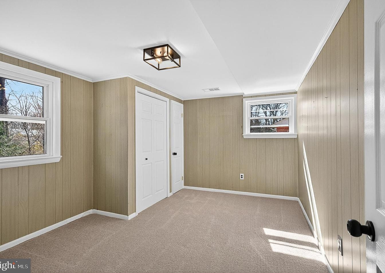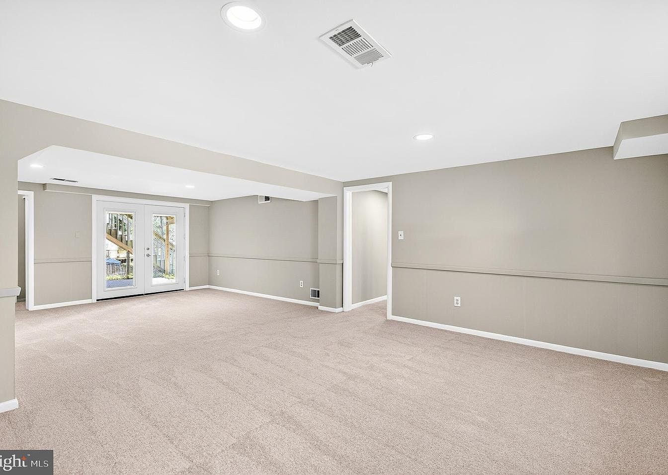 This spacious basement area features a soft beige carpet that extends across the floor, creating a cozy ambiance. The walls are painted in a light taupe, accented with subtle wainscoting, adding a touch of elegance. Natural light streams through French doors, leading to an outdoor space, enhancing the openness of the room. Bright recessed lighting illuminates the space, contrasting pleasantly with the warm tones. Architectural elements include a ceiling vent and a small nook that suggests versatility for various layouts. Overall, the design combines functionality with a warm, inviting aesthetic, ideal for a recreation room or office.