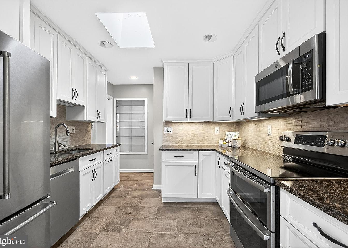 This sleek modern kitchen features a harmonious blend of functionality and style. White cabinetry with black hardware contrasts beautifully against the rich, dark granite countertops. A spacious layout offers ample storage, with crisp lines and a minimalist aesthetic. Natural light filters through a skylight, illuminating the clean, beige tile flooring that creates warmth. Stainless steel appliances, including a refrigerator and a microwave, complete the polished look. The subtle textured backsplash adds dimension, while an open doorway leads to a storage area, enhancing accessibility. Overall, the design emphasizes simplicity, practicality, and a contemporary feel.