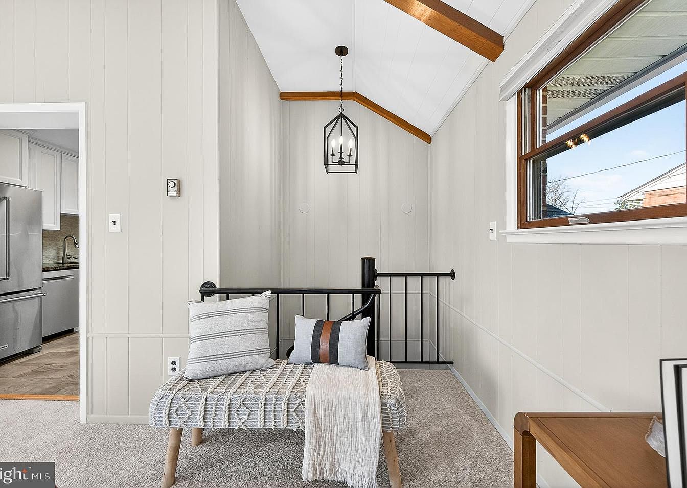 This space features a cozy entryway landing with a distinct A-frame ceiling, showcasing exposed wooden beams that enhance its rustic charm. The walls are clad in light gray paneling, offering a soft contrast to the white ceiling. A stylish wrought iron railing frames the area leading downward, providing a touch of sophistication. Beneath a black, geometric light fixture, a textured bench adorned with striped cushions invites comfort. The flooring is covered in plush light carpeting, adding warmth. A large window lets in natural light, while a subtle glimpse of the adjoining kitchen is visible through an open door.