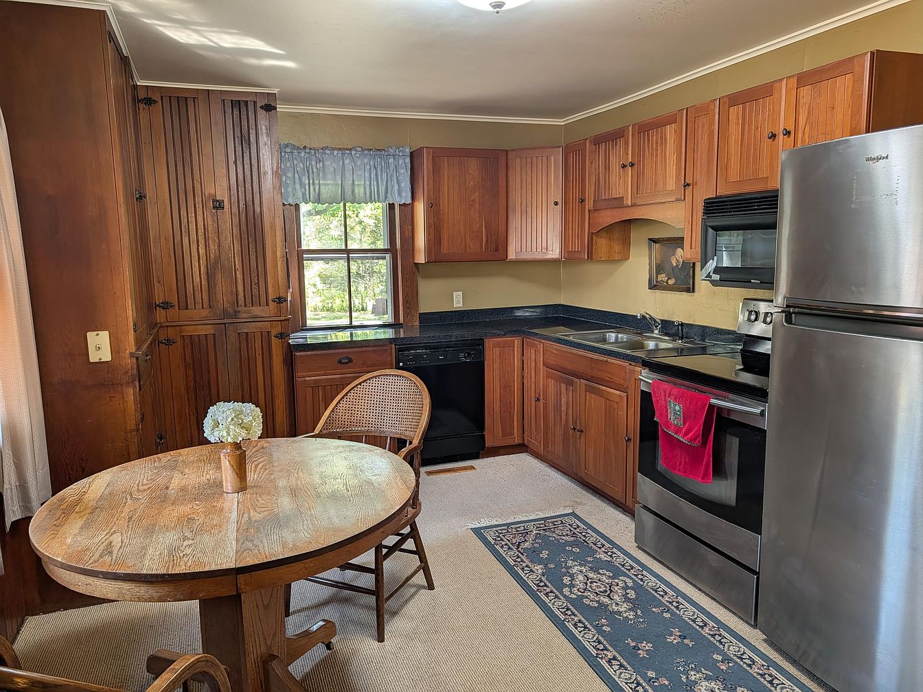 A cozy, traditional kitchen with warm wooden cabinets featuring vertical paneling and black hardware, creating a rustic feel. The corner window, framed by a blue ruffled curtain, allows natural light to illuminate the space and offers a view of greenery outside. The countertops are a dark stone, contrasting with the earth-toned painted walls. Modern stainless steel appliances, including a fridge and stove, blend seamlessly with the historic charm. A round wooden table for two sits in the foreground, adorned with a vase of white flowers, and a narrow Oriental-style rug adds an inviting, homely touch across the pale carpeted floor.