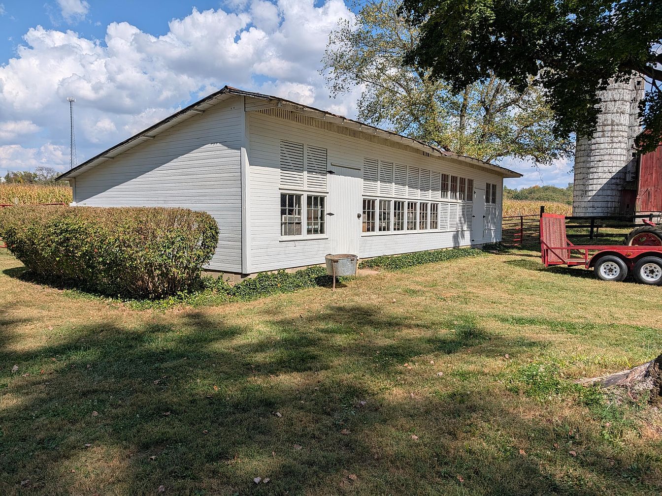 A white, single-story outbuilding sits on a neatly trimmed lawn, surrounded by farmland and mature trees. The structure features horizontal plank siding and a roof with a gentle slope. Multiple windows with white shutters line one long wall, allowing ample natural light inside. Close to the building, there are neatly manicured hedges on one end and some ivy creeping along the foundation. A red trailer is parked beside the building, and in the background, there is a tall, weathered silo and a hint of a barn, reinforcing the rural, historic feel of the property and its agricultural heritage.
