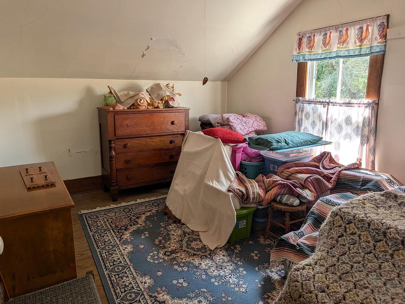 A small attic space with slanted ceilings and an aged appearance, characterized by its off-white, slightly cracked walls. The room features a chest of drawers made from dark, weathered wood, adorned with animal figurines. Natural light streams in from a window dressed with whimsical rooster-patterned valances and lace curtains. The floor is covered by a large, ornate blue area rug with floral motifs. Various colorful bins, boxes, pillows, and folded blankets are stacked and covered, indicating storage usage. Wooden furniture pieces and cozy, draped textiles lend a sense of nostalgia and lived-in comfort to the space.