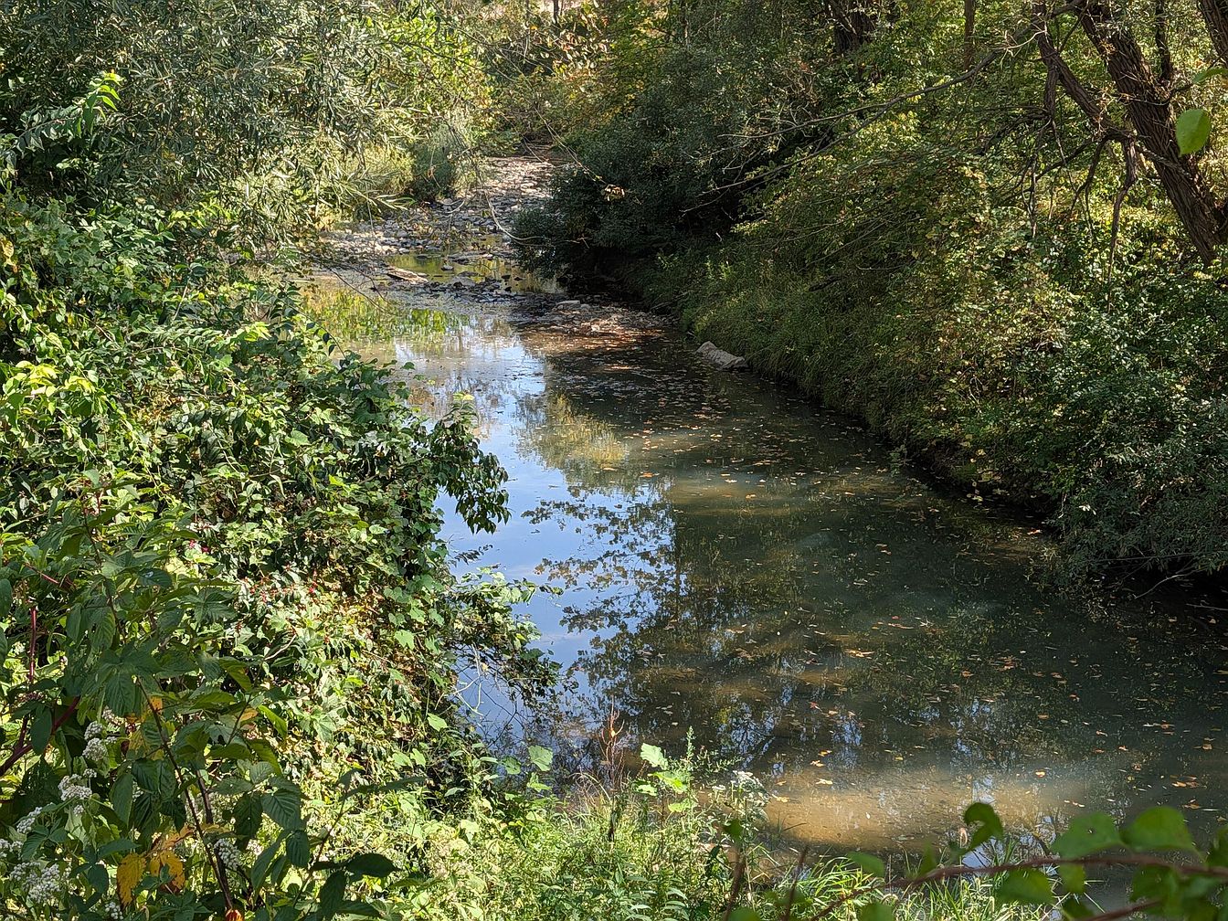 A gentle creek winds through lush greenery, bordered by dense, leafy vegetation and mature trees that arch overhead, casting dappled shade upon the water. The water is calm, its surface reflecting the blue sky and overhead branches. Banks are densely carpeted with a mix of grasses, shrubs, and wildflowers, lending a vibrant natural feel. Sunlight filters softly through the foliage, creating a tranquil, untouched wilderness atmosphere. The setting feels secluded and serene, emphasizing the natural beauty and peacefulness of the landscape, making it an idyllic spot for relaxation or observation of local wildlife and seasonal changes.