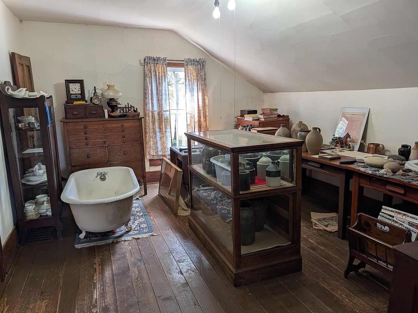 A collection-filled attic space with slanted ceilings and weathered wooden floors, characterized by an eclectic array of historic furnishings. A white clawfoot bathtub sits on a small oriental-style rug, flanked by a tall glass-fronted cabinet displaying delicate porcelain dishes. Central to the room is a wooden display case containing pottery and artifacts, while the back wall holds a large wooden dresser topped with vintage clocks and lamps. Rustic tables are crowded with stoneware jugs, books, papers, and various curiosities. Light filters softly through floral curtains at the window, creating a cozy yet slightly cluttered atmosphere reminiscent of an old study or personal museum.