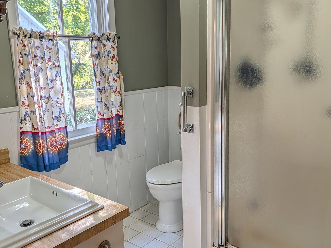 A compact bathroom bathed in natural light from a large window with white trim. The window is adorned with charming curtains featuring colorful butterflies and floral patterns in tones of blue, red, and orange. Below the window, a white tile floor leads to a traditional white toilet. To the right, a frosted glass shower stall with chrome hardware provides privacy. The vanity to the left features a white porcelain sink set into a warm wooden countertop. The walls combine sage green paint above crisp white paneling, creating a cozy and cheerful atmosphere with playful and vintage-inspired accents.