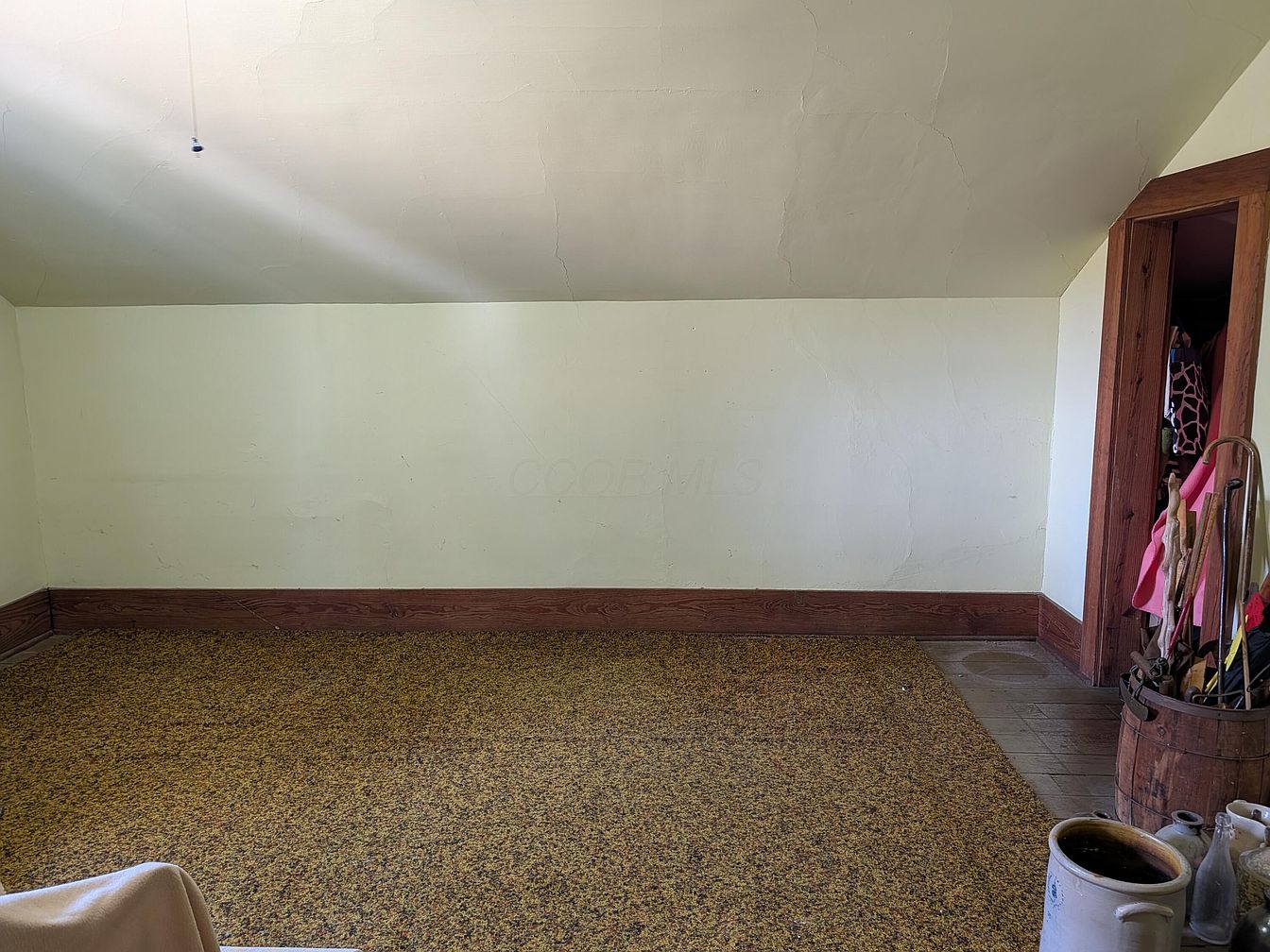 A quiet bedroom corner with softly angled ceilings suggesting it is located in the attic or upper level. Pale cream walls contrast with the warm, rich wood baseboards framing the perimeter. The carpet features a mottled golden-brown hue typical of vintage styles, while a portion of the floor near the adjoining doorway is exposed wood. The open wooden doorway reveals glimpses of a closet or adjacent room with clothing and a rustic bucket holding various sticks and handled items. Ceramic crocks and a blanket edge in the foreground add a subtle, historic touch to the room’s aesthetic.