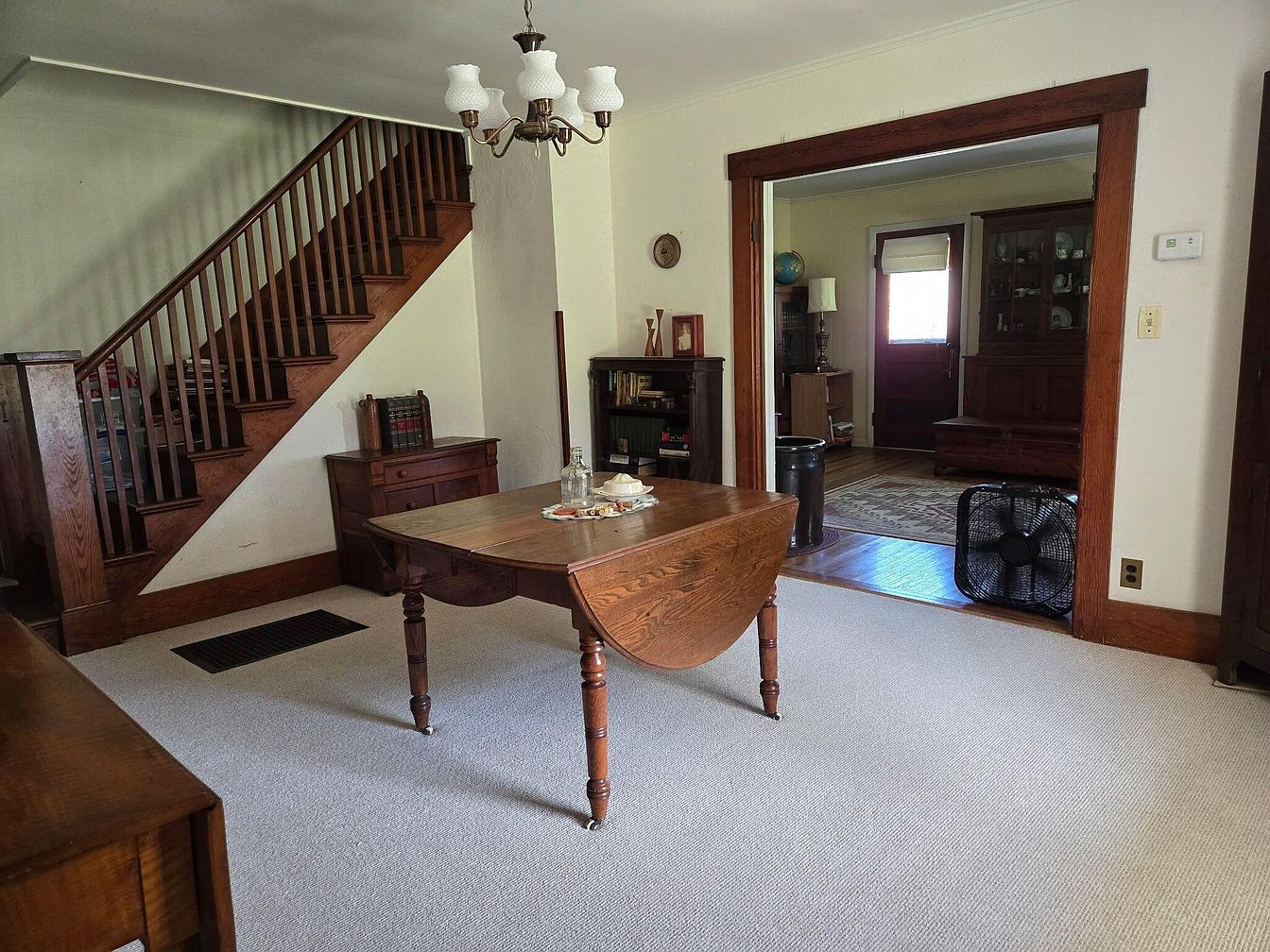 A cozy parlor area with a classic wooden staircase along the left wall, featuring dark-stained wood and vertical slats. The room is softly lit by a vintage chandelier with white glass shades. Neutral carpeting spans the floor, complemented by warm cream-colored walls. An antique drop-leaf wooden table stands at the center, adorned with a tray and a few glass items. Sturdy dark wood trim frames the doorway, leading into a secondary room with wood floors and more traditional furnishings, including a hutch and globe. Overall, the space combines early twentieth-century charm with understated, inviting décor.