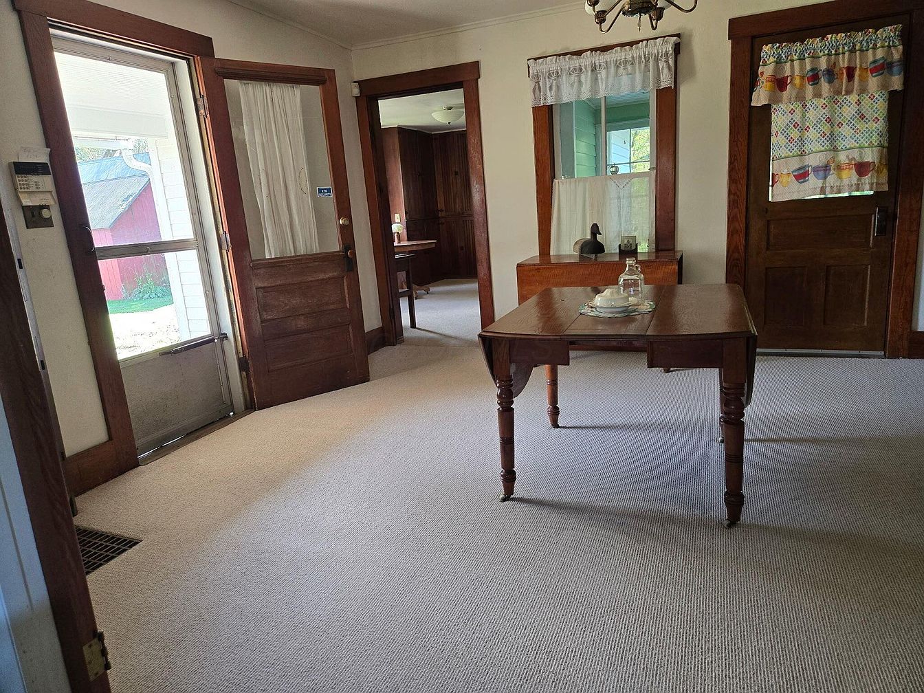 Bright, welcoming space with natural light coming through a glass storm door on the left, framed by medium-toned wood trim that matches other doors and windows. Neutral beige carpet covers the floor, giving a clean and spacious feel. At the center stands a sturdy wooden table set with a decorative glass cloche and plate. To the far side is another small wooden table with a carved duck accent and an old-fashioned telephone, adding vintage charm. Charming curtains with lace and colorful patterns hang on the window and rear door, lending a cozy, lived-in feel to this transitional space between rooms.