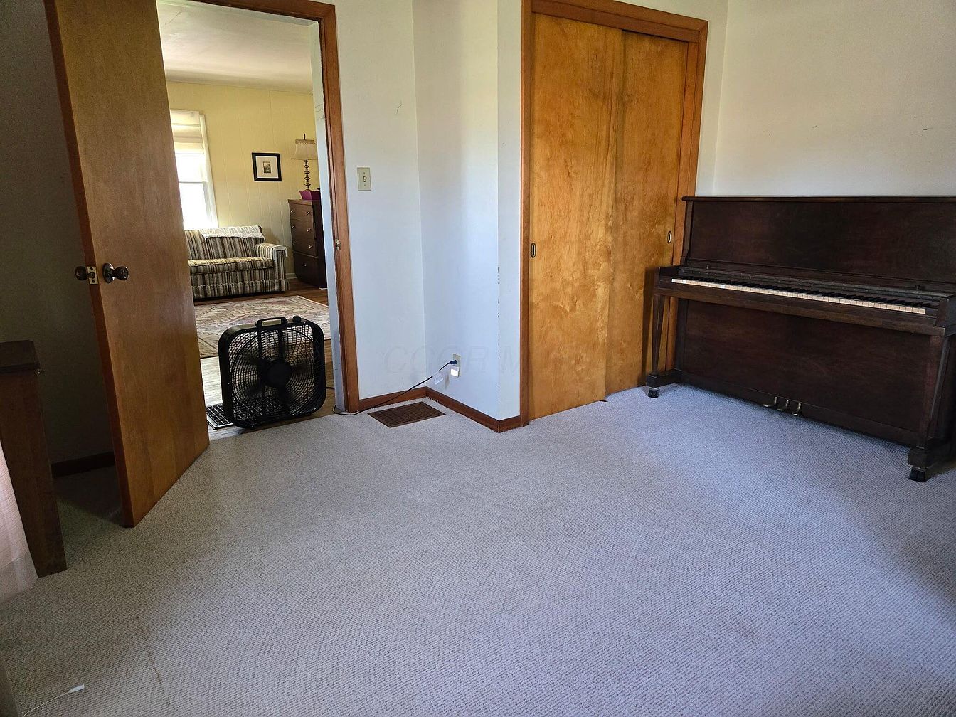 This space features pale carpeting and white walls bordered with natural wood trim. On one side, a dark upright piano sits against the wall near a large, double-door wooden closet. The entryway reveals an adjoining room containing a brown striped couch, a wooden dresser, a side table, and a standing lamp, with sunlight gently filtering in. A box fan rests on the floor by the threshold, suggesting casual airflow between rooms. The color palette blends neutral cream and wood tones for a modest, homey atmosphere, while the piano stands out as the key focal point amid uncluttered simplicity.