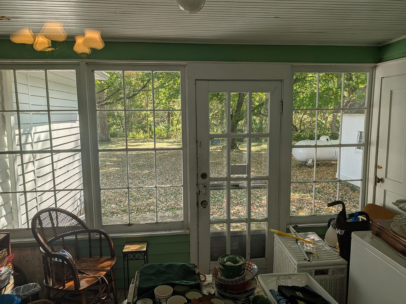 A cozy sunroom featuring a set of double French doors framed by tall, multi-pane windows that let in abundant natural light and offer a clear view of a leafy backyard. The ceiling is covered in white beadboard, adding a hint of vintage charm, while the walls below the windows are painted a soft green. Inside, a wooden cane-back chair sits next to a small table. Various items are scattered, including neatly stacked bowls, wicker baskets, and other household goods, suggesting a mix of utility and lived-in comfort in this transitional space leading outdoors.