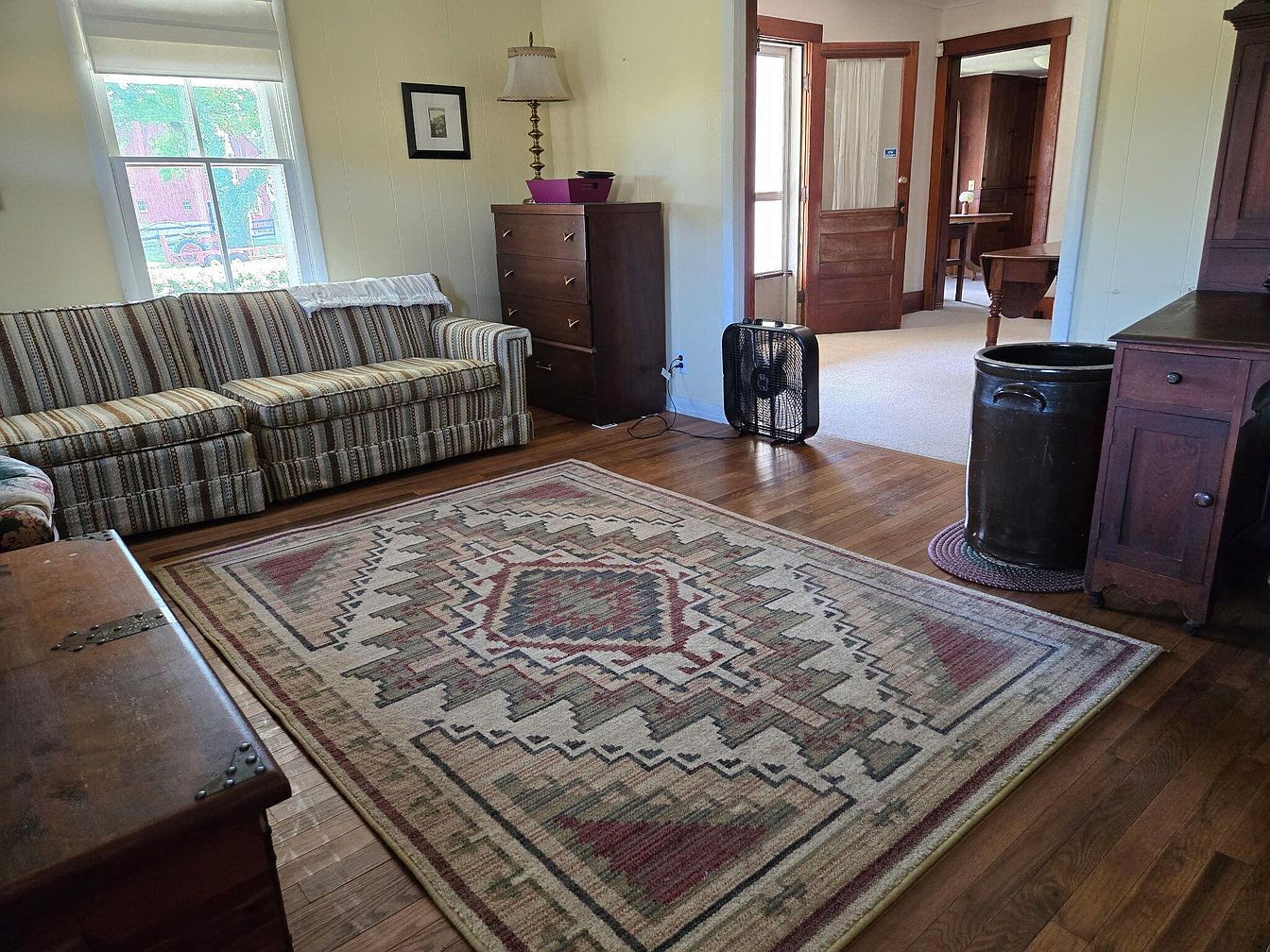 A cozy living room furnished with a striped, vintage sofa sits beneath a window with a white pull-down shade. The walls are painted a soft, pale yellow, and a framed artwork hangs above the couch. Floors are hardwood and partially covered by a large, geometric-patterned area rug in earthy tones: muted reds, greens, and beiges predominate. There is a tall chest of drawers with a brass table lamp and a small pink storage bin on top. A black box fan rests on the floor near a vintage black crock. Warm wood tones from Victorian-style furniture and natural light create a welcoming, historic ambiance.