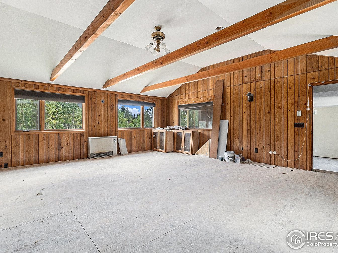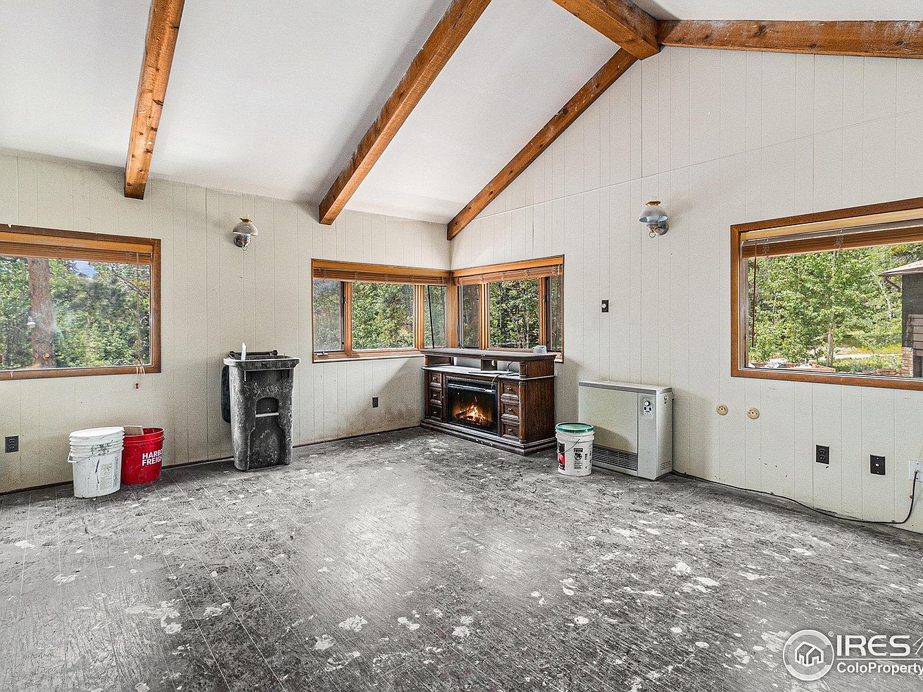 A spacious living room featuring a vaulted ceiling supported by exposed wooden beams, creating a warm and inviting atmosphere. Natural light floods in through multiple large windows framed in wood, offering views of the surrounding greenery. The walls are clad in simple light-colored paneling, enhancing the airy feel. A dark wooden entertainment unit is centered along one wall, providing storage and a cozy aesthetic with an electric fireplace below. The flooring appears worn, suggesting a rustic charm, complemented by scattered construction materials, indicating ongoing renovation. This room offers a blend of comfort and potential, ready for personal touches.