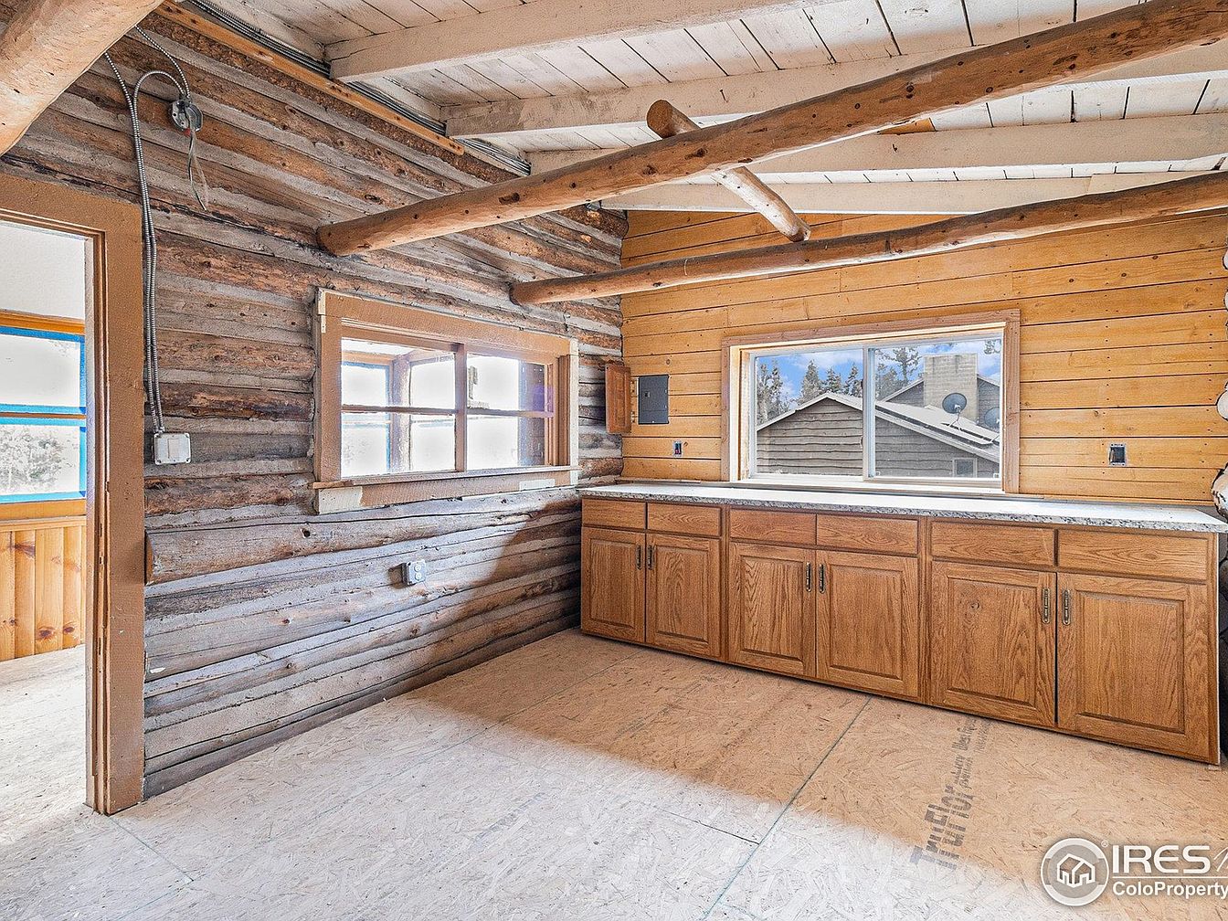 This rustic kitchen features an open layout with natural wood accents and exposed beams, enhancing the farmhouse aesthetic. The walls exhibit a mix of rough-hewn logs and smooth wooden panels, creating a warm and inviting atmosphere. A long countertop runs along the base, supported by light oak cabinetry with simple handles. Large windows allow ample natural light, showcasing the scenic outdoor view. The flooring is a light, unfinished surface, complementing the varied tones of wood, while the ceiling beams contribute to a spacious feel. Ideal for a cozy cooking space that blends traditional charm with functionality.