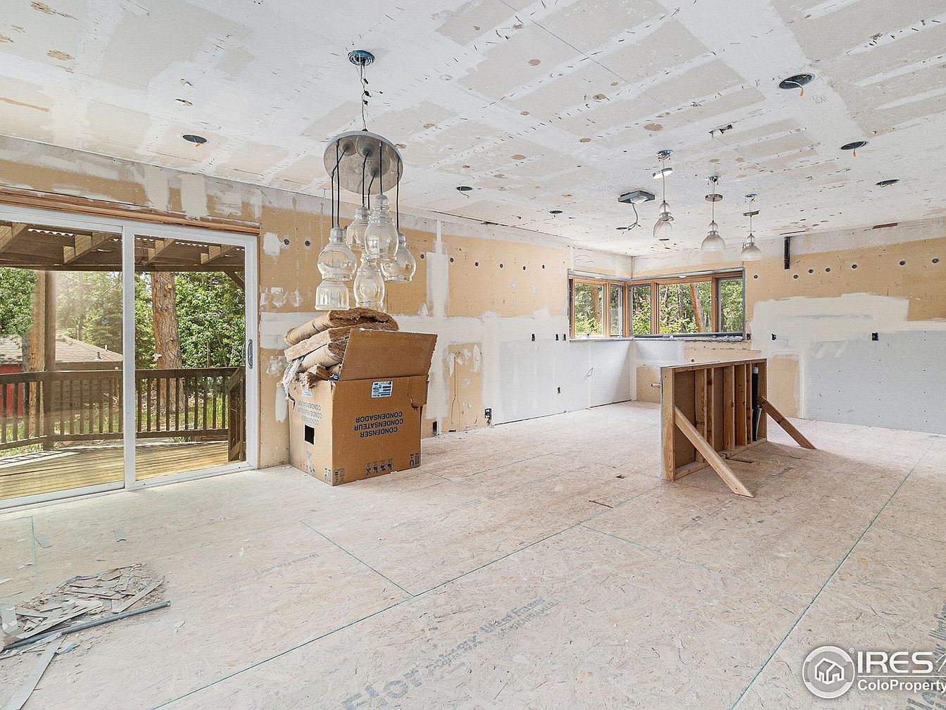 This spacious living room features tall, vaulted ceilings accentuated by wooden panels that create a warm and rustic atmosphere. The wall behind the fireplace is constructed from a mix of stone and brick, serving as a focal point and providing a cozy ambiance. Large, black-framed windows flood the space with natural light, offering views of the surrounding greenery. A simple, yet functional kitchen area is partially visible, with cabinetry and countertop materials that harmonize with the wood tones. The light-colored flooring contrasts elegantly with the darker walls, enhancing the room’s welcoming feel while still in the renovation phase.