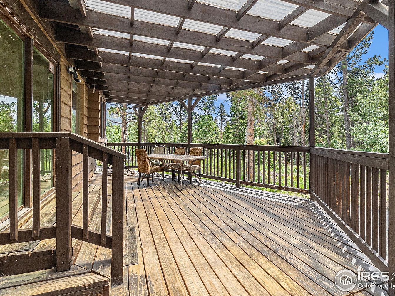 The image showcases a spacious outdoor deck that merges seamlessly with nature. Dark wooden railings and flooring create a rustic yet inviting atmosphere. A sturdy pergola, with a transparent roofing that filters sunlight, provides shade while allowing natural light to filter through. The arrangement features a round table surrounded by four woven chairs, perfect for alfresco dining. Surrounding tall trees add privacy and a sense of tranquility. The sturdy construction and rich wooden tones harmonize with the verdant backdrop, making it a serene retreat for relaxation or gatherings.