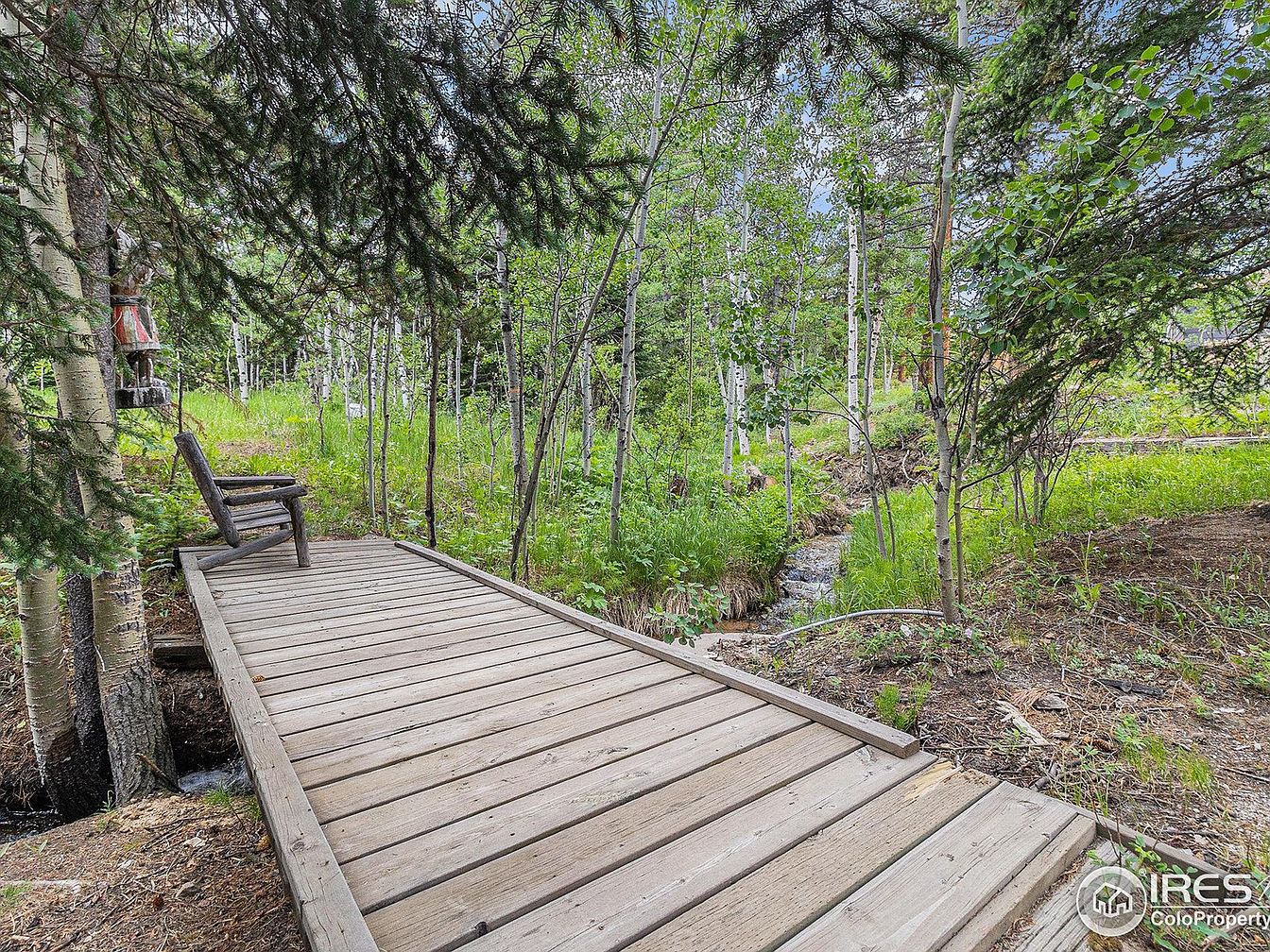 A wooden walkway meanders through a lush, verdant landscape, flanked by tall, slender trees. The path, made of wide wooden planks, is rustic and natural, connecting seamlessly with its environment. A sturdy wooden outdoor chair placed to the left invites quiet reflection, perfect for enjoying the surrounding serenity. Green grasses and foliage create a vibrant backdrop, interspersed with sunlight filtering through the tree canopies. A gentle stream flows alongside, adding a soothing soundtrack to this peaceful retreat. The mix of natural elements and rustic furniture enhances the inviting, serene atmosphere of this outdoor space.