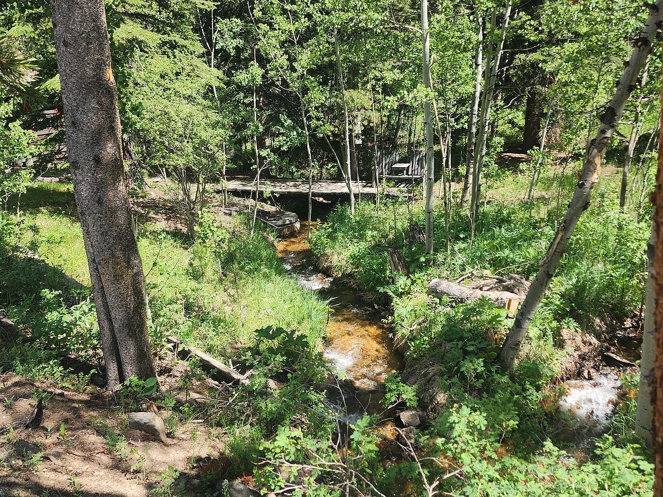A serene garden area featuring a gently flowing stream, surrounded by vibrant green foliage and young trees. The landscape is dotted with a variety of lush greenery, including small bushes and grass, creating a tranquil natural setting. The clear water of the stream reflects sunlight, enhancing its inviting appearance. A rustic wooden bridge crosses over the stream, offering a connection to a distant seating area visible through the trees. The overall ambiance is peaceful, showcasing the beauty of nature while providing a perfect spot for relaxation or contemplation.