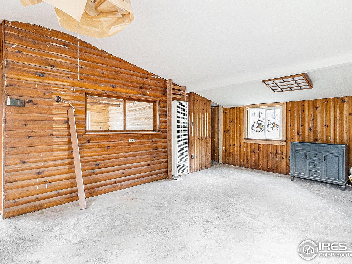 This spacious living room features a minimalist design with exposed wooden beams spanning the ceiling, enhancing its rustic charm. The walls are covered in rich wood paneling, creating a warm, inviting atmosphere. Large windows line two sides, flooding the space with natural light and offering scenic views of the outdoors. A subtle color palette of browns and neutrals emphasizes the natural elements. The flooring appears unfinished, suggesting ongoing renovations. An air conditioning unit is visible, along with a few construction materials, hinting at potential updates. Overall, the room balances contemporary openness with traditional wood detailing.