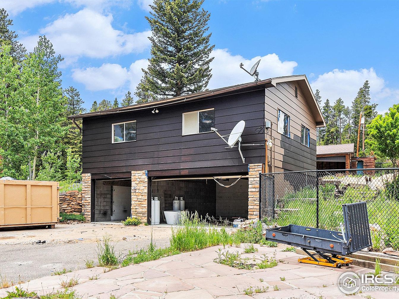 The image shows a rustic two-story house featuring a dark wood facade and stone accents at the base. Large windows punctuate the upper floor, allowing light to filter in, while satellite dishes extend from the exterior. Below, the ground floor is a garage-like space, showcasing equipment like gas tanks. Surrounding the home are patches of natural greenery, with tall pines and shrubs contributing to a serene, outdoor atmosphere. The driveway is gravelly, with a hint of disarray from landscaping, as the area appears partially unkempt. A fenced perimeter indicates boundaries amidst the tranquil scenery.