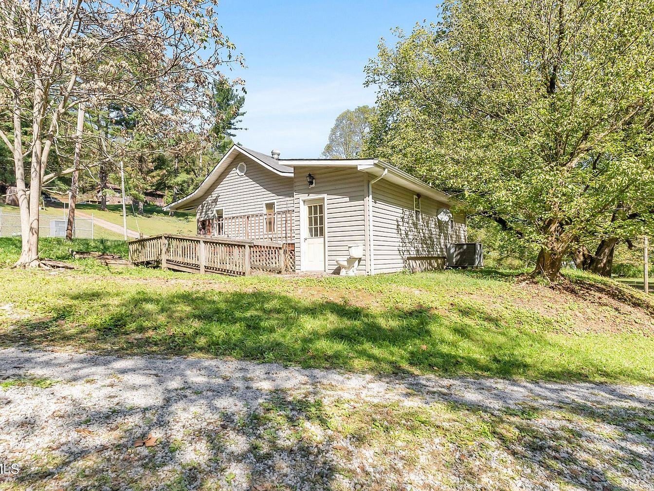 The image showcases the exterior of a quaint, historic American home, featuring a gentle sloped roof and a charming porch. Pale taupe siding contrasts against the greenery surrounding the house, creating a cozy feel. The porch, supported by sturdy posts, has a wooden rocking chair, inviting relaxation. Natural light floods the front windows, framed by white trims. Overgrown grass and scattered foliage enhance the rustic atmosphere, while a worn wooden deck suggests an area for outdoor enjoyment. The house is set against a backdrop of trees, suggesting tranquility and a connection to nature in this serene landscape.