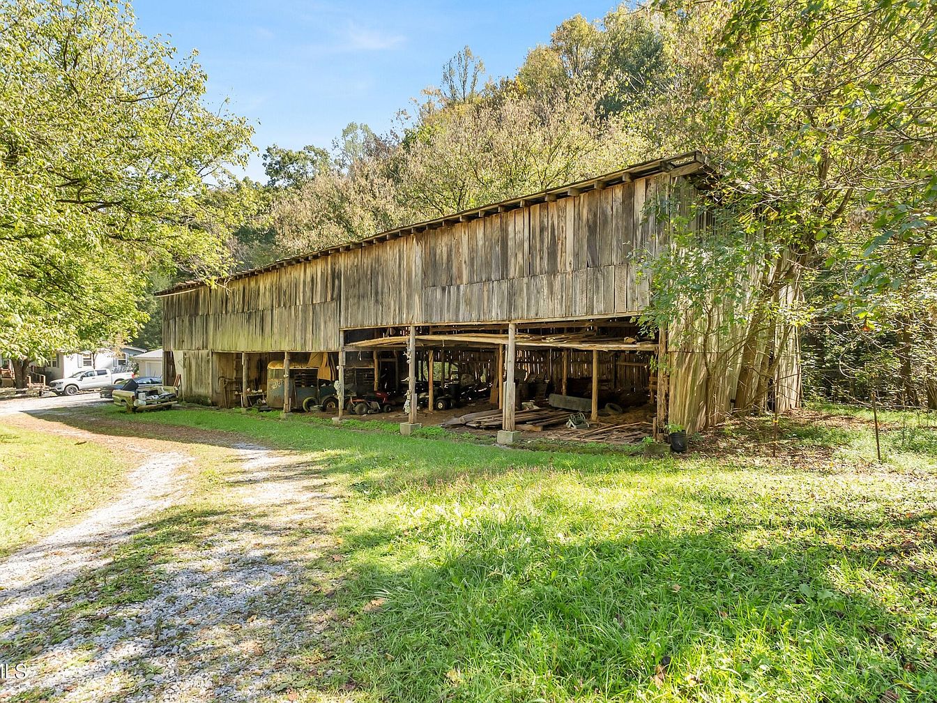 This spacious storage barn features a rustic wooden facade, showcasing weathered boards that add character and history. Elevated on wooden posts, the structure allows for ample airflow beneath. Surrounded by lush green grass and mature trees, the setting evokes a rural charm. A gravel path leads to the barn, highlighting its accessibility. Inside, various tools and equipment can be seen, emphasizing its utility. The overall color palette is warm, with earthy tones from the wood contrasting against the vibrant green surroundings. The architecture of the barn reflects traditional craftsmanship, making it a significant element of the property.
