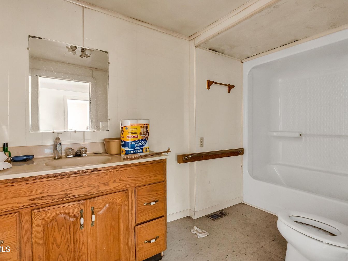 This bathroom features a simple layout with essential fixtures. A wooden vanity with a light oak finish is paired with a white countertop, complemented by a rectangular mirror above it. To the left, there’s a white bathtub with a textured surface, adjacent to a toilet in a neutral tone. The walls are predominantly white, enhancing the sense of space, while the flooring is a light-colored linoleum that adds practicality. Minimal storage is provided by a wooden towel rack and items are casually arranged, indicating the space is functional but in need of updates to enhance its aesthetic appeal.
