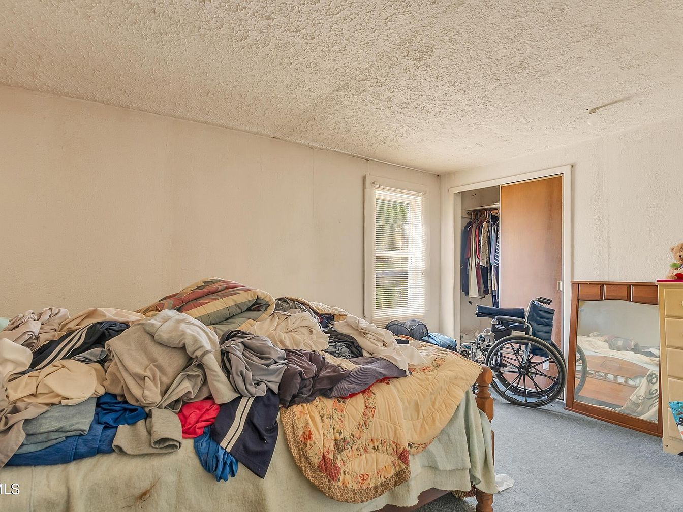 This bedroom features a disheveled bed with a colorful array of clothing and blankets piled haphazardly on top. The walls are painted a light cream, with a textured ceiling adding depth to the space. Natural light filters through a window adorned with horizontal blinds, casting shadows across the room. An open closet reveals various hanging clothes, while a wheelchair rests in the corner, emphasizing accessibility. A wooden dresser with a mirror stands opposite the bed, slightly reflective with its warm wood tones contrasting the cooler blue-gray carpet. The overall atmosphere conveys a lived-in feel, with hints of personal belongings.