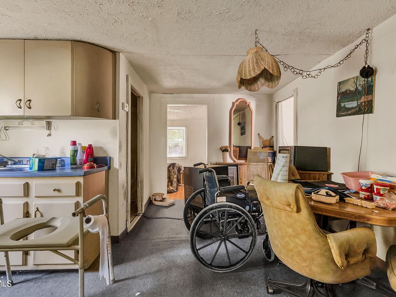 The space highlights a modest living area with a combined kitchenette. Light walls contrast with dark furniture, creating a cozy atmosphere. There are gray carpeting and a small blue countertop, bordered by beige cabinetry. A large, ornate mirror framed in pastel pink captures attention, reflecting soft natural light from nearby windows. Vintage wooden chairs sit around a cluttered table, adorned with everyday items, showcasing a lived-in feel. A peculiar woven light fixture hangs from the ceiling, adding character. In a corner, a wheelchair indicates accessibility considerations, blending functionality with the home’s nostalgic charm.