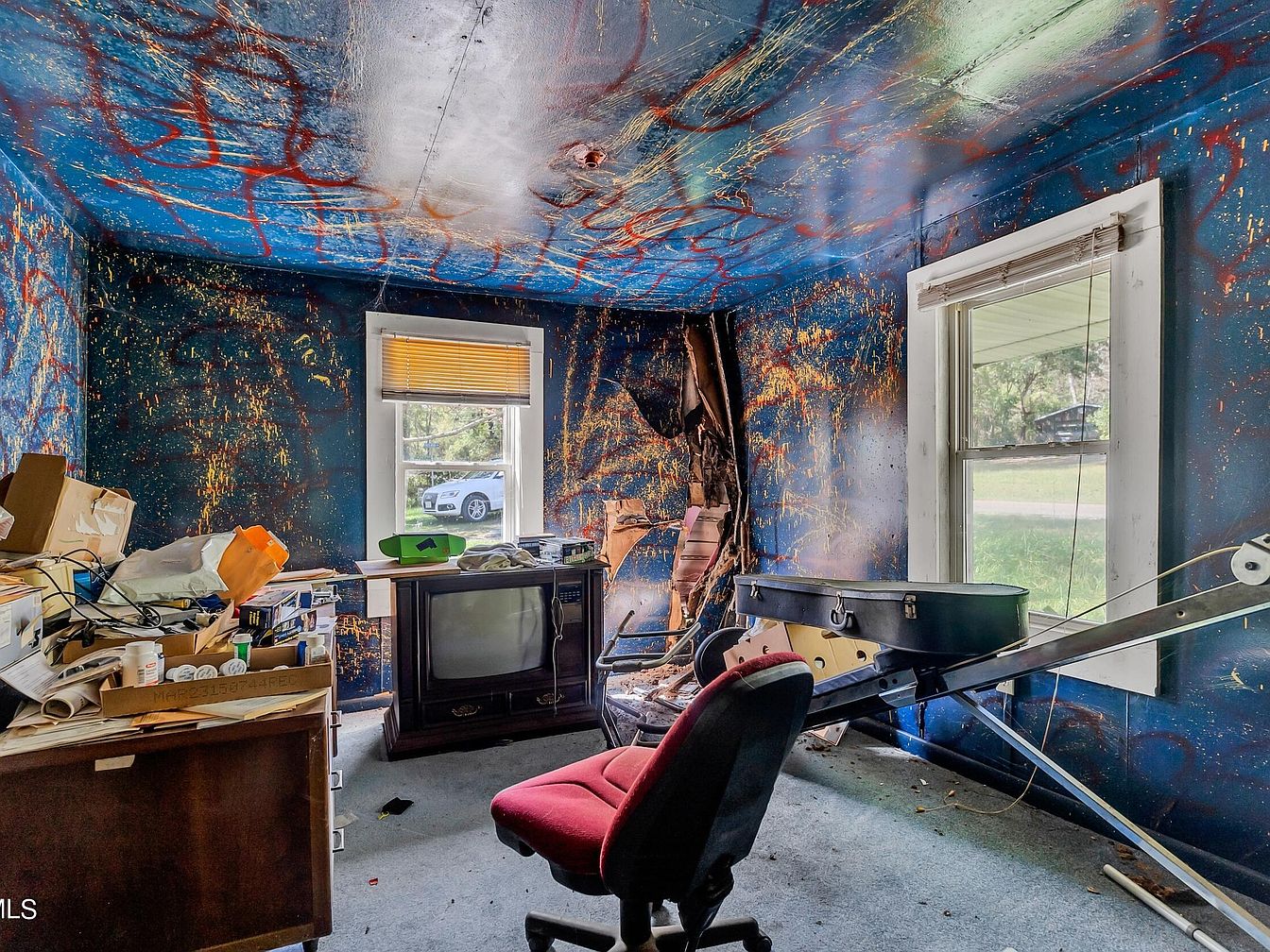 This chaotic space, likely a former living or hobby room, features striking blue walls adorned with vibrant splashes of orange and gold, adding a unique artistic flair. A cluttered desk sits prominently, surrounded by scattered papers and boxes, suggesting neglect. A vintage television stands against the wall, accompanied by an office chair in deep red, providing a stark color contrast. Natural light filters through one window, illuminating the dust and debris. An old, unused musical instrument rests nearby, enhancing the room’s abandoned feel. The carpet is worn and stained, further indicating disuse and need for revitalization.
