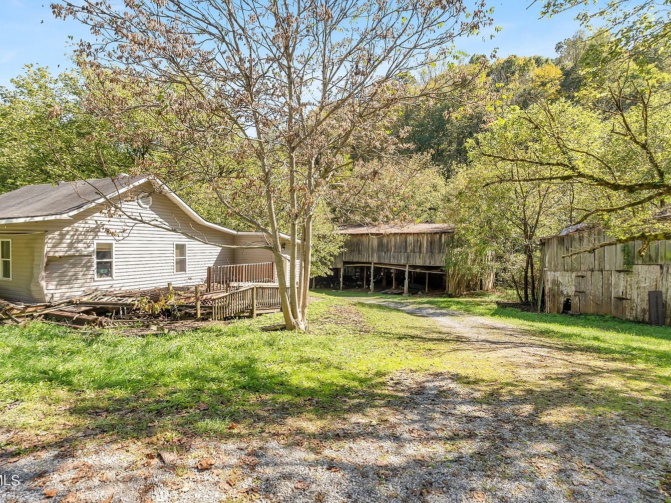 A serene side view of a historic American home reveals a gently sloping yard adorned with lush greenery. The house features a simple, pale siding accentuated by an inviting wooden porch, partially covered by weathered planks. Several tall trees frame the scene, casting dappled shadows on the grassy ground. To the right, rustic outbuildings add character, their aged wood blending seamlessly with the natural surroundings. A gravel pathway leads through the yard, hinting at a well-trodden route. Sunlight filters through the leaves, creating a peaceful ambiance, ideal for enjoying nature’s tranquility.