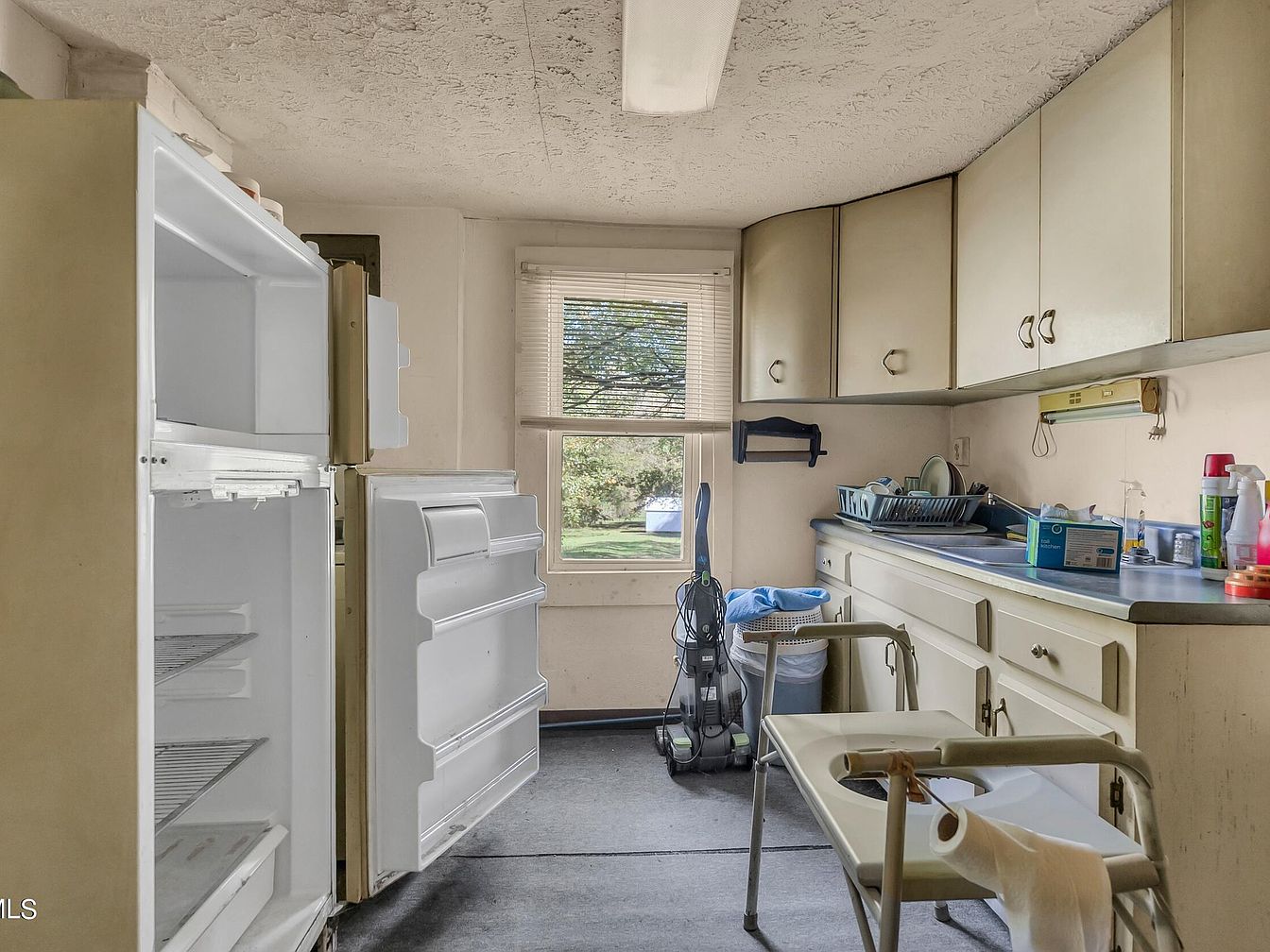 The kitchen features a functional layout with a vintage vibe, showcasing light beige cabinetry that complements the neutral-colored walls. A classic refrigerator stands open to the left, hinting at the space’s utility. A window allows natural light, illuminating the work surfaces and casting a warm glow. Counter space accommodates a dish rack filled with dishes, alongside various cleaning items. A vacuum cleaner leans against the wall, emphasizing the active use of the space. The flooring appears practical, maintaining a simple aesthetic, while a folding chair offers a casual seating option, completing this quaint and inviting kitchen atmosphere.