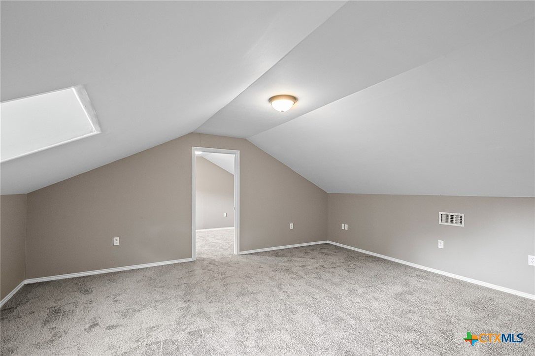 This attic space features a triangular ceiling, emphasizing its unique sloped architecture. The walls are painted in a soft taupe color, creating a warm and inviting atmosphere. Natural light filters through a skylight, brightening the area. The floor is covered in plush, light gray carpeting, enhancing the cozy feel. A doorway is visible, leading to another room, suggesting potential for versatile use, such as a home office or extra bedroom. Minimalistic electrical outlets and a vent are present, functioning for convenience. Overall, the design combines practicality with understated elegance, ideal for a quaint living area.