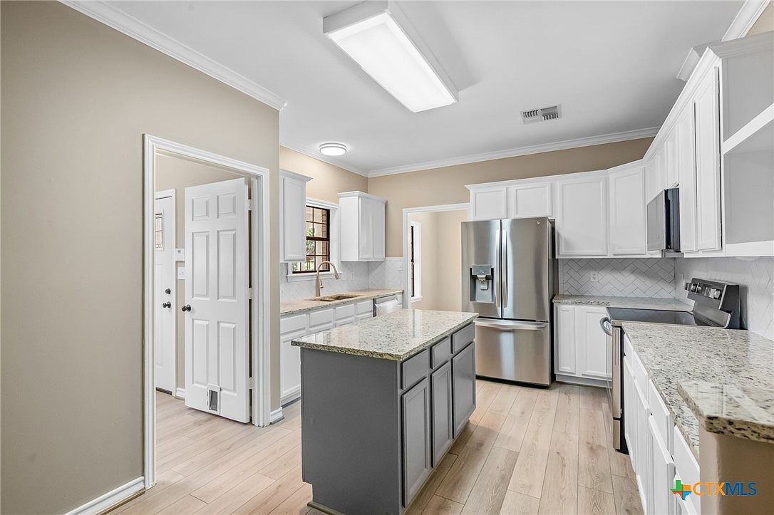 The kitchen features a spacious layout with light-colored cabinets and a contrasting dark gray island, enhancing depth. The countertops are composed of a sleek, speckled granite, providing both style and durability. White walls contribute to a bright, airy atmosphere, complemented by natural light streaming through the window. Stainless steel appliances, including a modern refrigerator and oven, add a contemporary touch against the classic design. The flooring is light wood, promoting warmth and continuity, while geometric tiles behind the stove introduce a subtle texture that draws the eye. Overall, the space combines functionality and elegance.