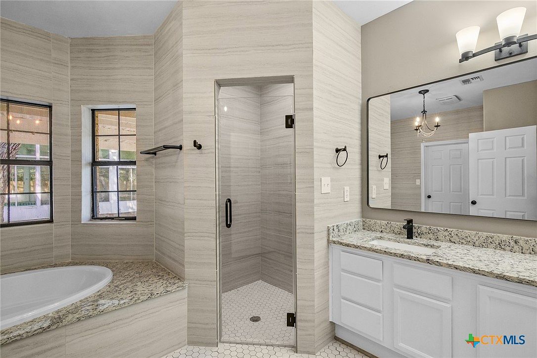 The space features a well-designed bathroom suite with a blend of modern and classic elements. Light, neutral-colored stone walls enhance the airy feel, complemented by a freestanding tub beside a large granite countertop. A sleek glass-enclosed shower showcases black fixtures against hexagonal tile, adding a contemporary touch. Windows framed in dark trim provide natural light, revealing a view of the outdoor area. The vanity cabinet boasts a clean, white finish, creating a crisp contrast with the granite surface. An elegant chandelier illuminates, adding a hint of sophistication, while circular mirrors enhance the sense of space.