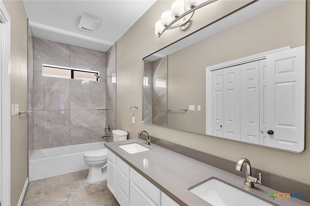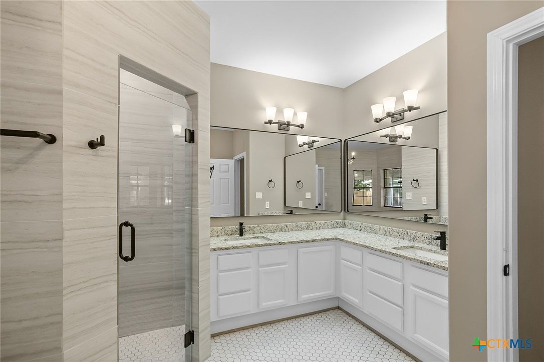 This spacious bathroom features a modern aesthetic with a light and neutral color scheme. The walls are painted a soft beige, complementing the elegant white cabinetry beneath a stunning granite countertop. A large, frameless glass shower with sleek black hardware stands on one side, showcasing contemporary elegance. Dual mirrors add depth, reflecting the stylish sconces that provide warm, ambient lighting. The hexagonal white tiles on the flooring add a touch of classic charm, creating a cohesive look. Overall, the room balances functionality with a serene retreat, highlighting both comfort and style in the design.