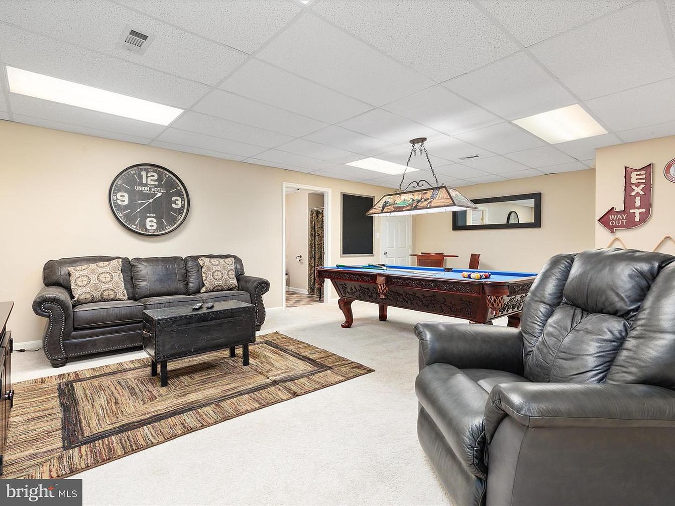 This cozy game room features a comfortable leather sofa adorned with decorative pillows, complemented by a rustic coffee table. A large wall clock adds a vintage touch, enhancing the room’s charm. The space includes a pool table with intricate woodwork, positioned beneath a unique hanging light fixture. A plush, multi-toned area rug anchors the seating area, harmonizing with the neutral beige walls. Adjacent to the pool table, a framed mirror reflects light, creating an inviting atmosphere. The visible exit sign and door lead to additional areas, suggesting practicality mixed with leisure in this inviting entertainment space.
