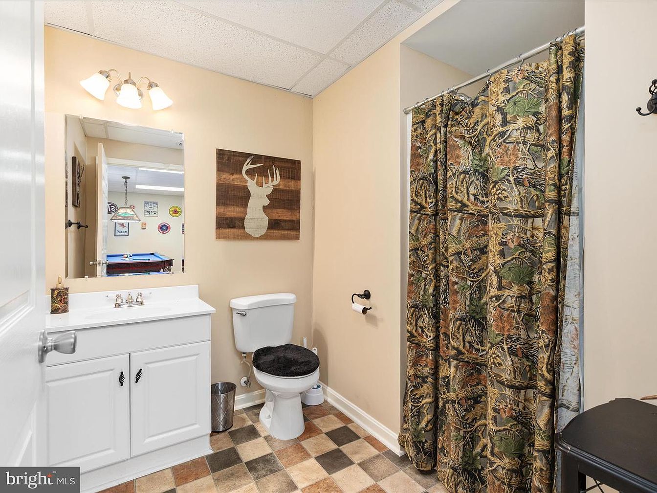 This bathroom features a compact layout with essential fixtures. The double sink vanity is adorned with white cabinetry, complemented by a polished countertop. A mirror reflects light from a trio of ceiling-mounted lights. The walls are painted a soft, warm beige, harmonizing with the earthy tones of the checkered floor tiles, which alternate between dark brown and beige. A toilet is positioned against one wall, topped with a cozy black seat cover. A vibrant, nature-themed shower curtain adds a touch of personality. In the background, a glimpse of another room showcases a pool table, enhancing the casual, homey atmosphere.