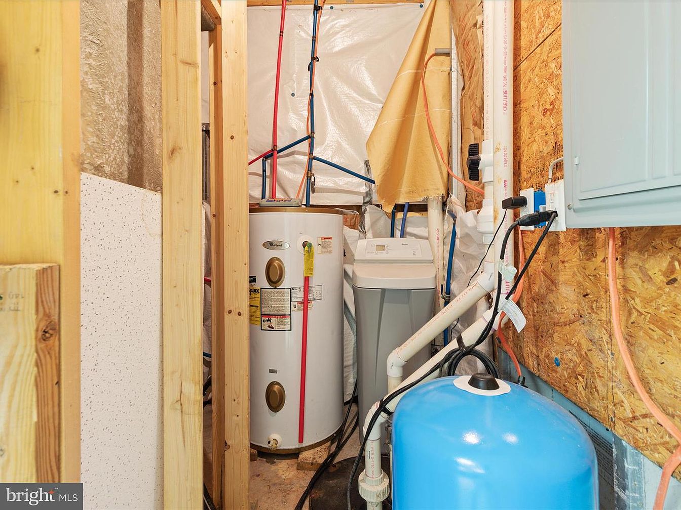 This utility room features functional amenities essential for home maintenance. A white water heater stands centrally, flanked by a gray washing machine. Exposed plumbing and utility lines, brightly colored in red and blue, showcase the mechanical workings of the space. The walls are primarily unadorned, made of oriented strand board, creating a rustic, unfinished look. The flooring appears practical and durable, likely conducive to heavy usage. Wood framing is visible, adding structural detail, while a plastic sheet drapes in the corner, hinting at moisture control. This room prioritizes utility over aesthetics, with minimal decoration.