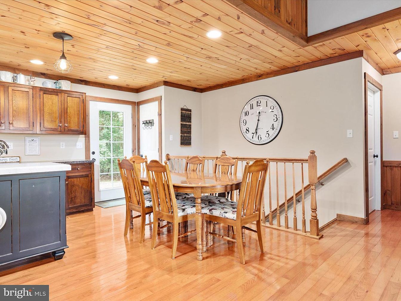 This dining area showcases a blend of rustic charm and modern functionality. A natural wood dining table accompanied by matching wooden chairs, adorned with patterned cushions, creates an inviting atmosphere. The floor features polished hardwood, reflecting warm tones throughout the space. The ceiling, crafted from wooden planks, adds an earthy touch, complemented by stylish pendant lighting. A large wall clock serves as both a decorative and practical element, while the adjacent kitchen boasts rich oak cabinets and a bright, airy feel thanks to French doors leading outdoors. This combination of elements exudes a cozy, comfortable vibe.
