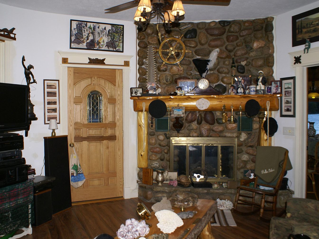 This cozy living room features a striking stone fireplace as its focal point, creating a rustic yet inviting ambiance. The walls are adorned with a blend of framed artwork and photographs, enhancing the space’s personal touch. A warmly-painted wooden door complements the natural wood accents found in the mantel and furniture. The color palette includes earthy tones of browns and soft whites, harmonizing with the rich wooden flooring. A comfortable rocking chair and coffee table add to the relaxation vibe, while decorative elements like nautical memorabilia contribute character and charm to this intimate gathering space.