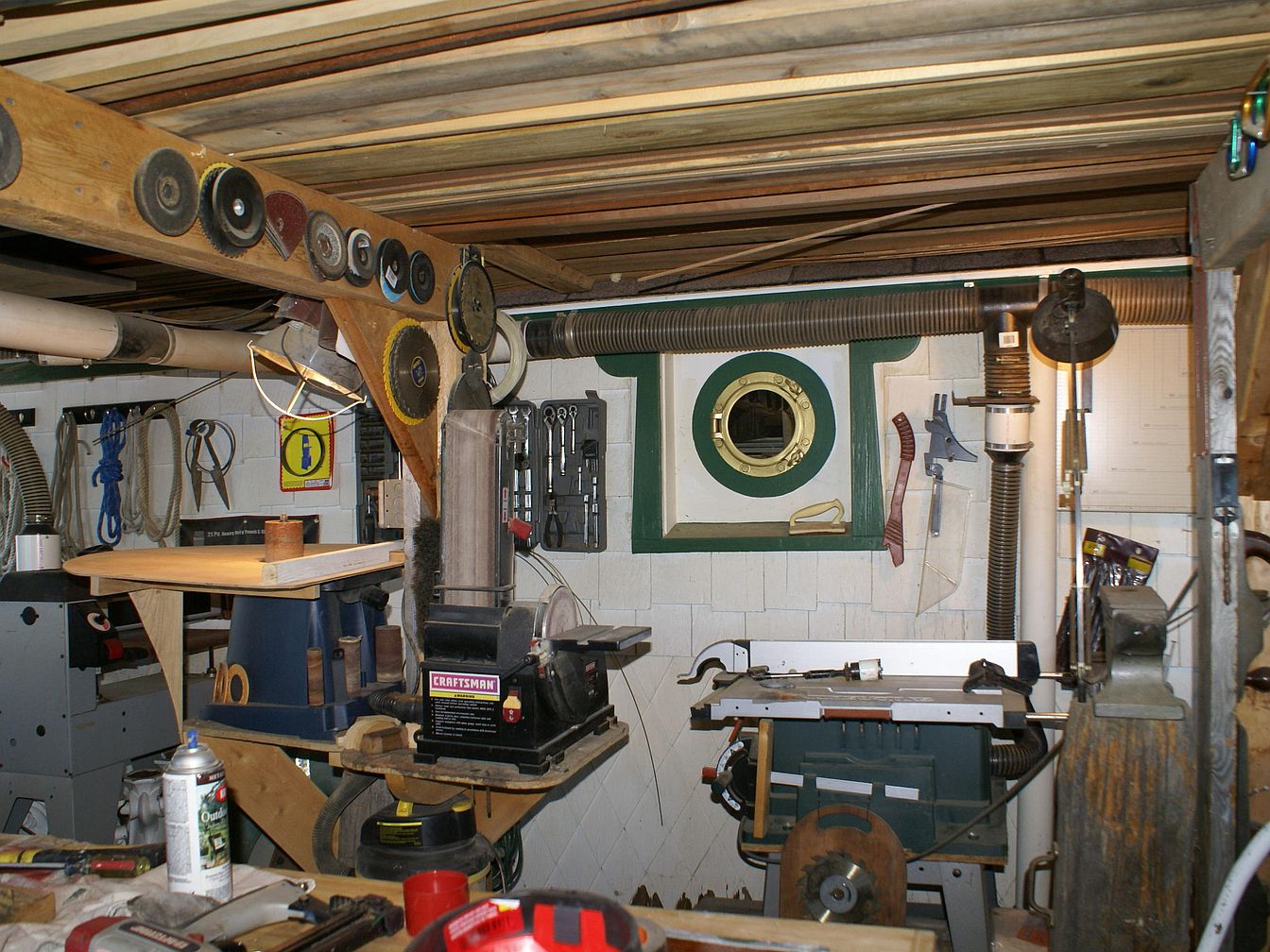 This space serves as a woodworking workshop, characterized by an arrangement of tools and machinery. The wooden beams and rustic elements create a warm, industrial aesthetic. A variety of saw blades hang neatly above, showcasing an organized, practical design. A prominent worktable is centrally situated, complemented by a blue sander and gray table saw, indicating active use. The walls feature light-colored panels that contrast with darker beams overhead, enhancing depth. A circular window with green trim adds a unique architectural touch, providing natural light and visual interest. Decorated with various tools, the atmosphere is utilitarian yet inviting.