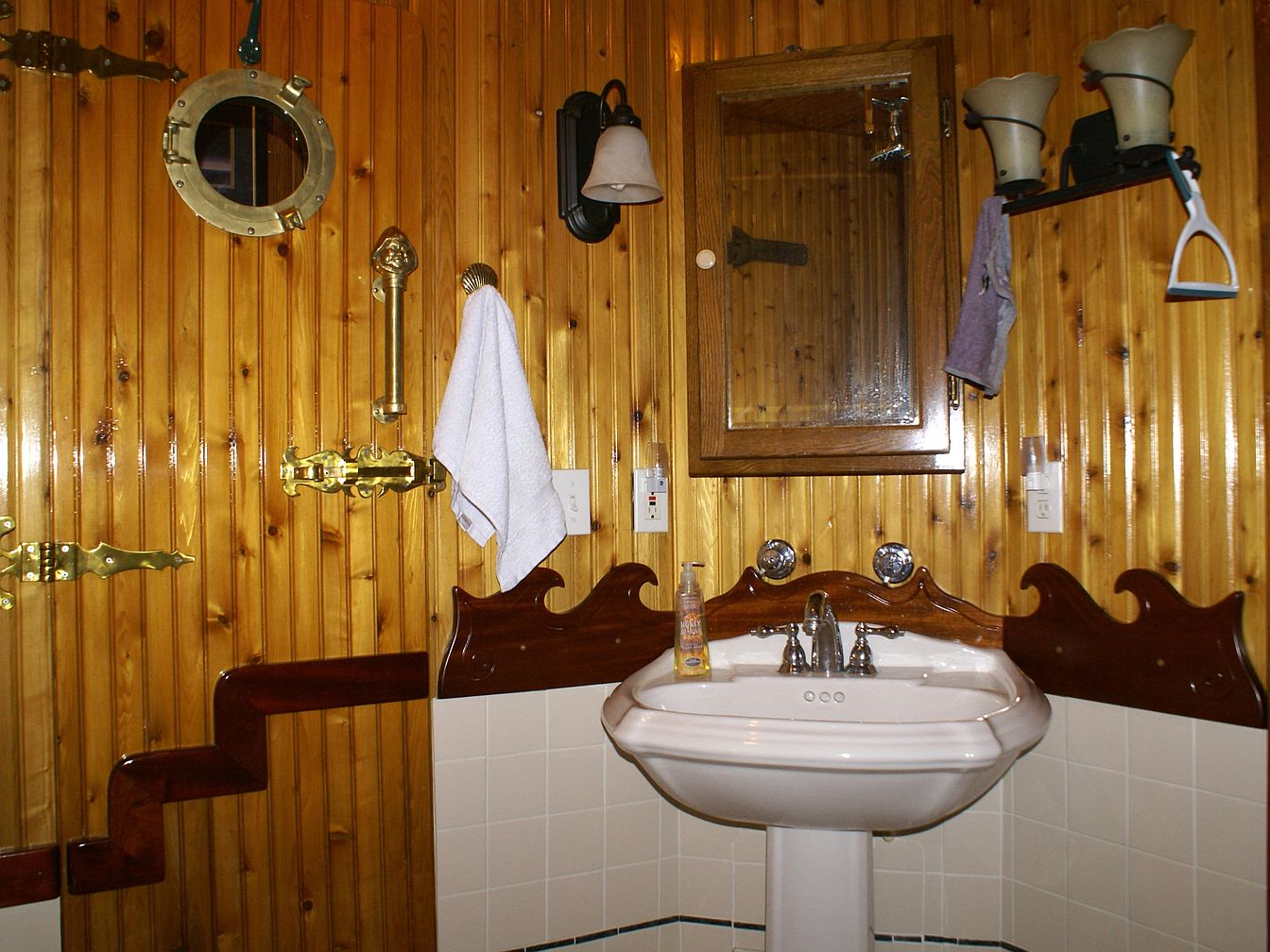This bathroom features warm wooden walls with vertical planks, emphasizing a cozy, rustic atmosphere. The wood has a shiny finish, enhancing its natural grain. A round, porthole-style window adds a touch of nautical charm. The sink, elegant with ornate detailing, stands on a pedestal, complemented by a decorative wooden backsplash. A vintage mirror hangs above the sink, reflecting the elements of the room. Decorative lighting fixtures with soft shades provide ambient illumination, while a towel rack made of polished brass echoes the marine theme. The overall palette consists of earthy tones, contributing to a welcoming and serene vibe.