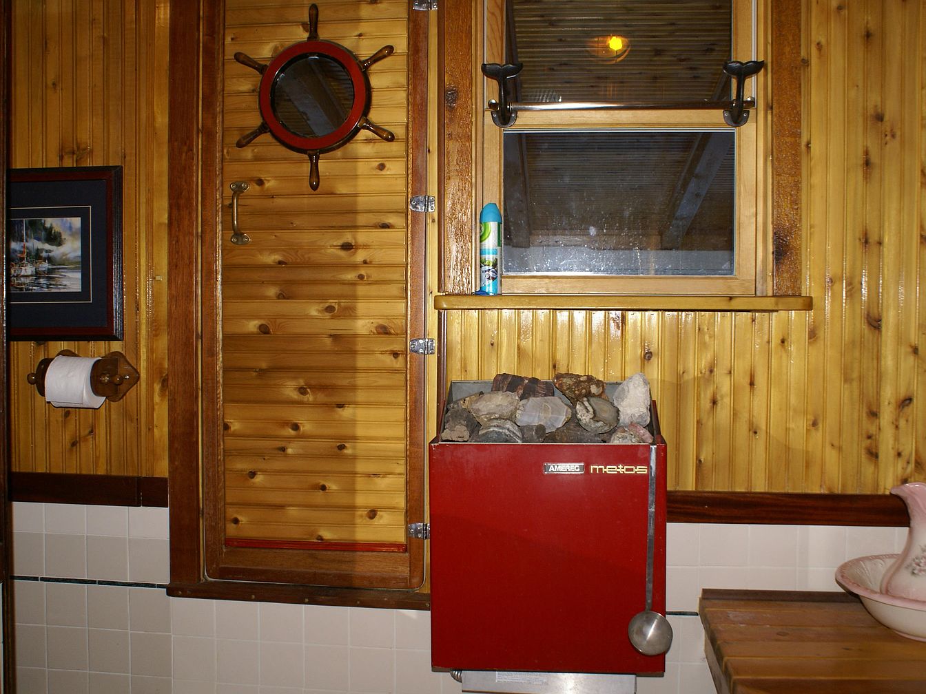 This space features a charming design with rich wooden paneling that creates a rustic atmosphere. The door, adorned with horizontal slats, is complemented by a ship wheel mirror above it, enhancing the nautical theme. A framed painting of boats adds a touch of artistry. To the left, a wooden holder displays toilet paper, subtly blending with the wood accents. Beneath the window, a bright red heater contrasts with the warm tones of the wood and includes a small scoop for convenience. The window, surrounded by the same wooden materials, offers natural light, illuminating the room’s unique details.