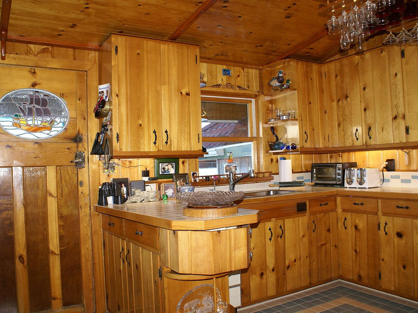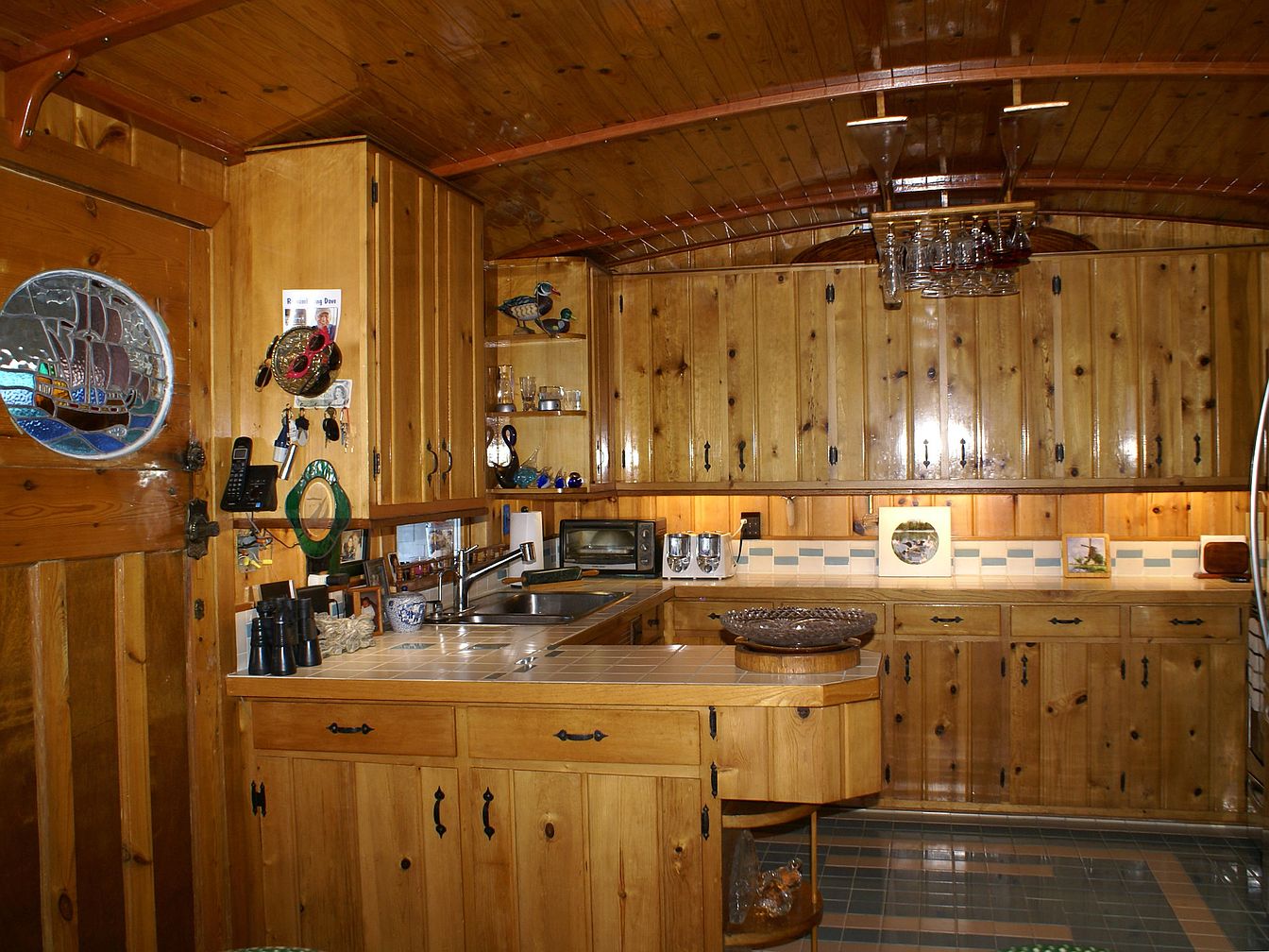 This kitchen features rich wooden cabinetry and paneling, creating a warm, inviting atmosphere. The walls and ceiling display a natural pine finish, highlighted by a stained-glass window that showcases a sailing ship, adding character and light. A corner sink offers a practical workspace, while the countertop displays a simple yet elegant arrangement of kitchenware. Above, shelves contain decorative glassware and a few charming collectibles. The kitchen appliances, including a microwave and toaster, are subtly integrated within the cabinetry. The floor is tiled in a muted blue and gray pattern, contrasting beautifully with the wooden elements.