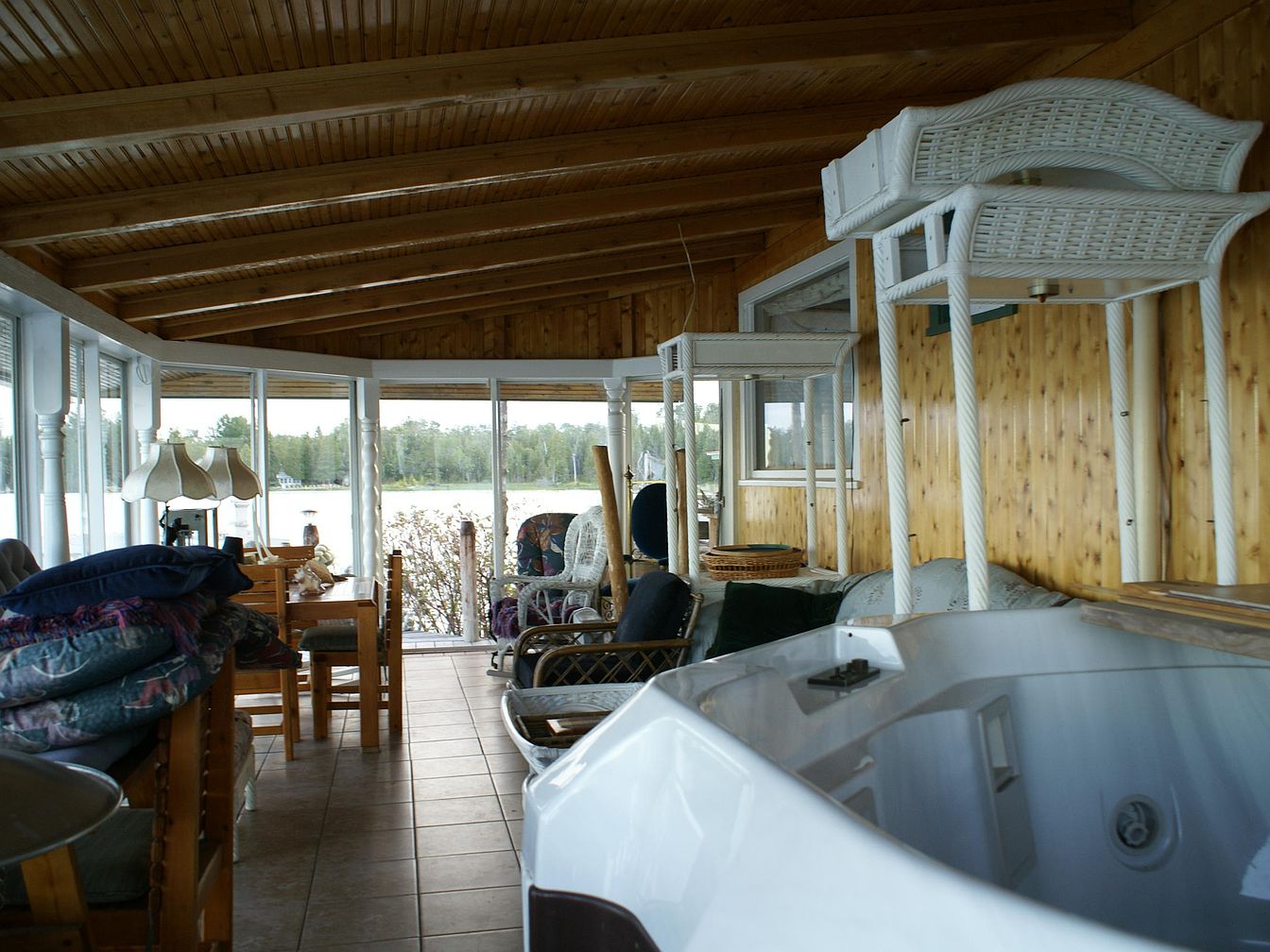 This sunroom features a bright, inviting atmosphere with large glass windows that offer expansive views of the outdoors. The wood-paneled walls and exposed wooden beams create a warm, rustic charm. A variety of seating options, including wicker chairs and a wooden dining table, enhance the cozy feel. Soft, colorful cushions add pops of color against the neutral palette. A hot tub occupies a corner, suggesting relaxation and leisure. A floor lamp stands illuminating the space, while decorative items and a basket contribute to the inviting, lived-in aesthetic, making it an ideal spot for gathering or solitude.
