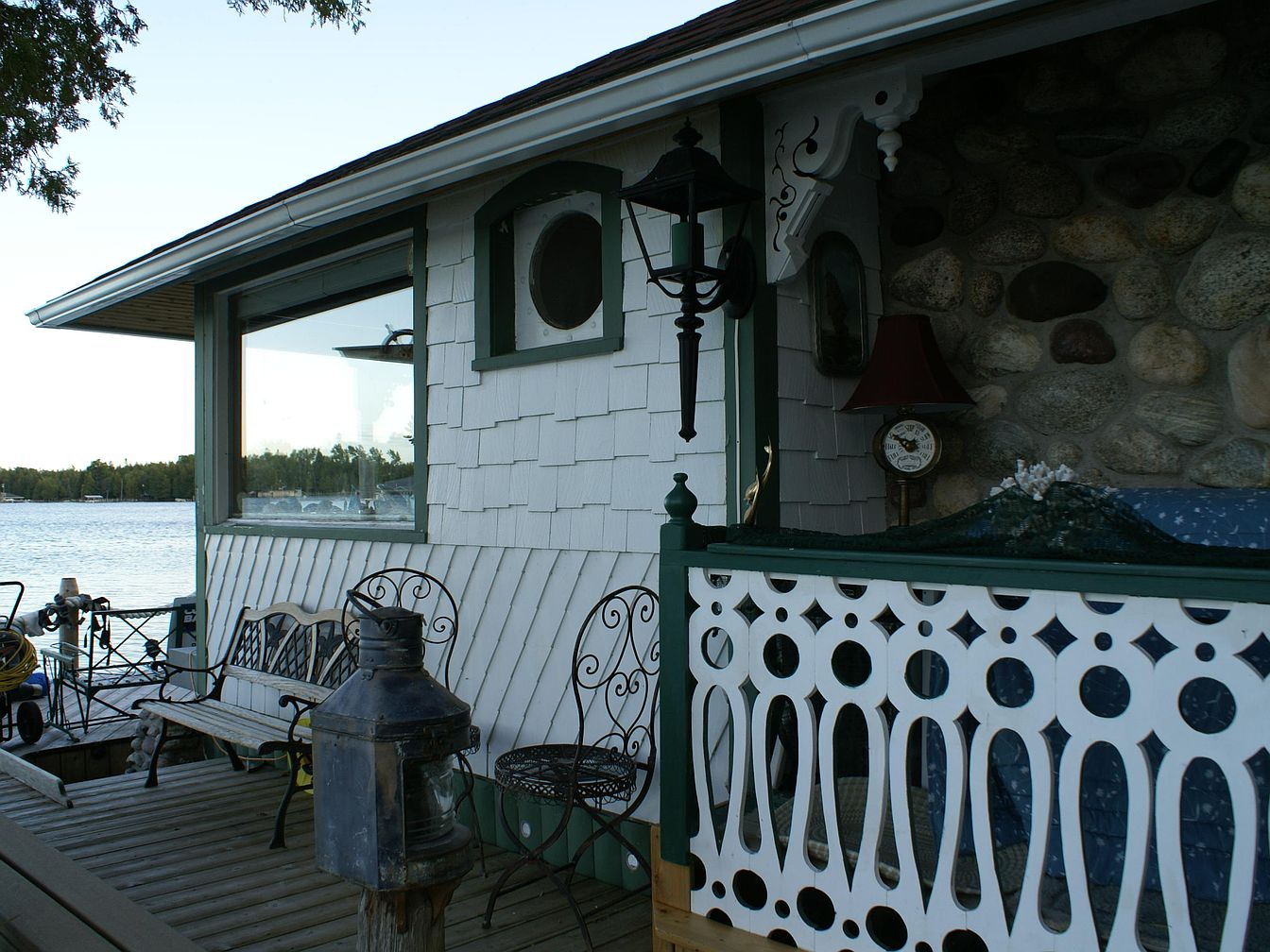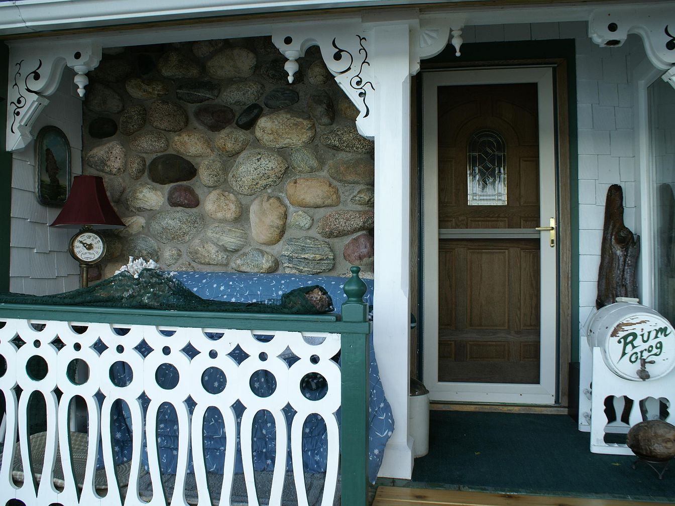 This image showcases a charming porch area with a rustic aesthetic, combining natural materials and vintage elements. The exterior features white wooden shingles accented by green trim, creating a fresh and inviting look. A stone wall adds texture and warmth, while a vintage lantern hangs beside the window, offering a touch of nostalgia. The porch furniture consists of a metal bench and a round table, giving the space a cozy feel. A seating area adorned with blue cushions invites relaxation, while decorative railings with intricate cutouts enhance the overall charm. The nearby water view complements the tranquil ambiance.