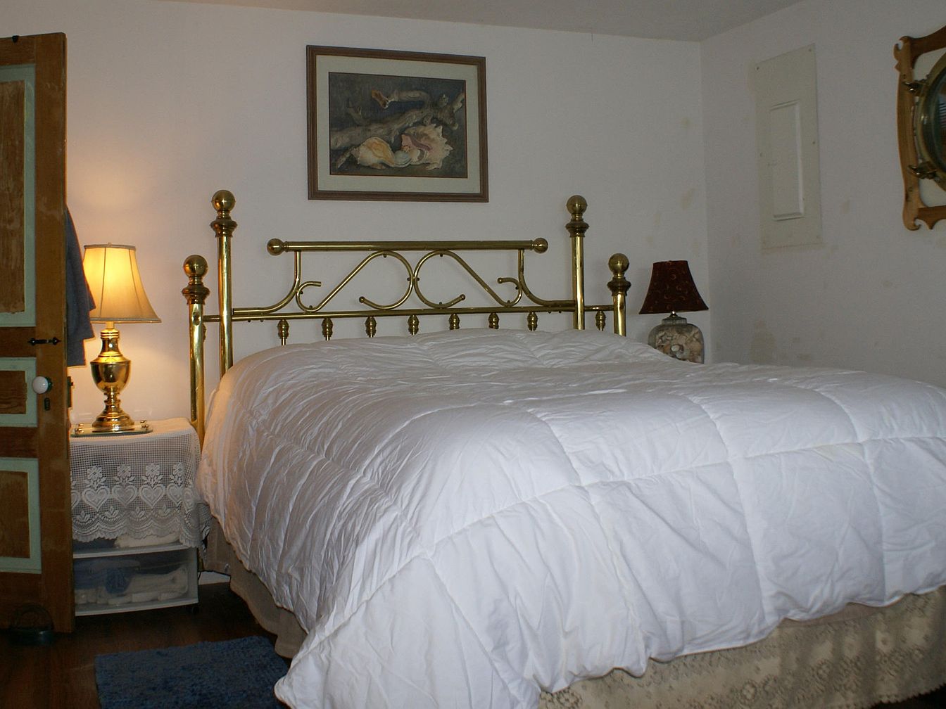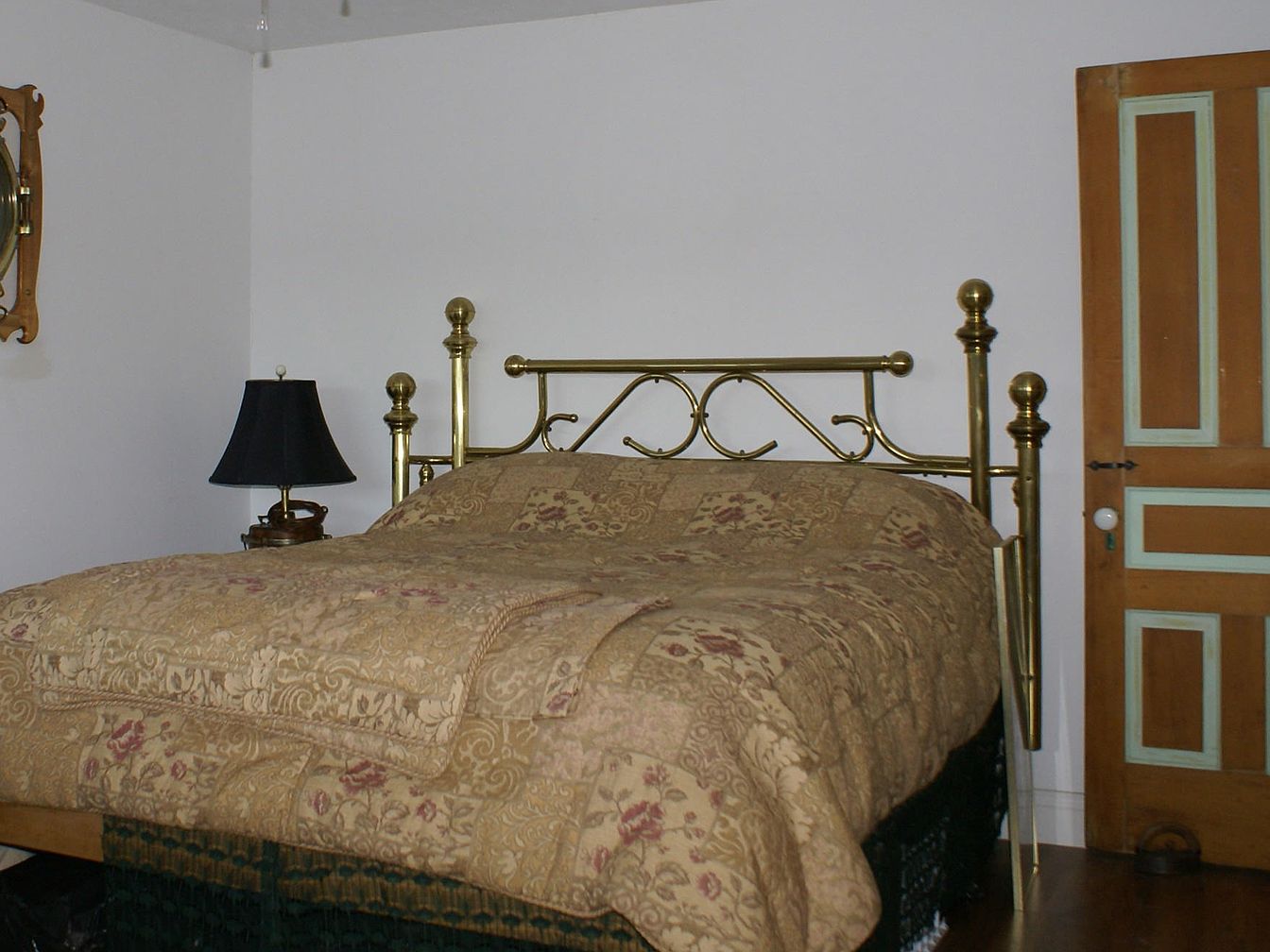 The bedroom showcases a cozy atmosphere centered around a brass bed frame adorned with a plush white comforter. A vintage-style painting hangs above the bed, adding an artistic touch. To the left, an antique wooden door with a greenish hue opens partially, revealing a glimpse into the room’s history. A decorative nightstand beside the bed stands topped with a classic lamp that emits a warm glow, creating an inviting ambiance. A small, elegant lamp with a patterned shade stands adjacent, enhancing the room’s charm. The flooring features polished wood, while the walls are painted a soft, neutral tone.